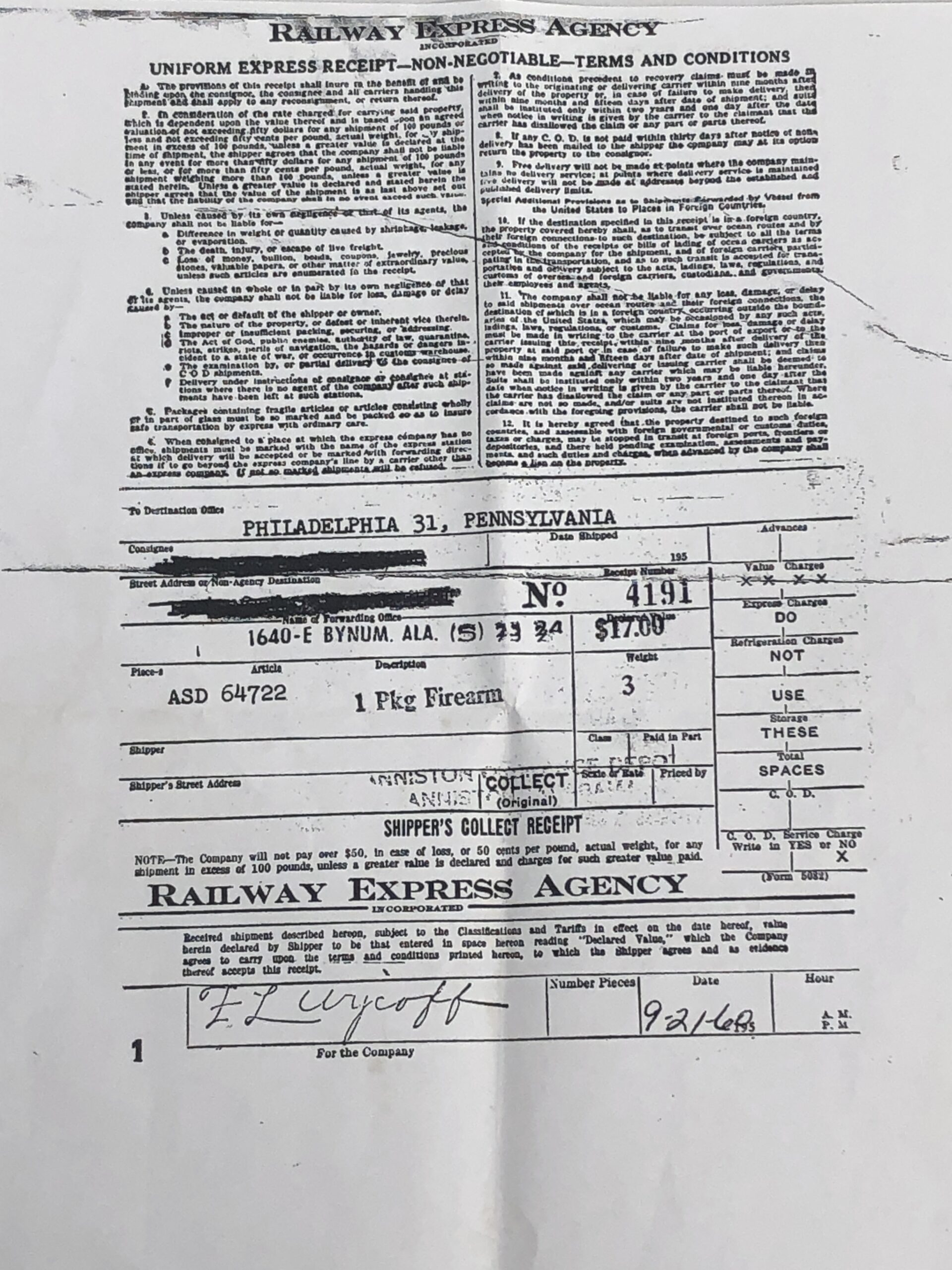 This model denotes a relatively early five digit serial number (37541). It also notes the flaming bomb stamp along with “F K” initials, noting completion of WW2 US Arsenal overhaul/upgrades at Rock Island Arsenal with acceptance by Frank Krack, the inspector at RIA from 1941-1946. After approximately 47 years of ownership and service in the United States Army, this weapon was sold off by the US Military in 1960 through the Civilian Marksmanship Program. It was shipped out of the US Army’s Anniston Ordnance Depot in Bynum, AL to civilian in the Philadelphia, PA area. This model will come with its original CMP shipping box and wax paper, along with two magazines, one of which is still sealed in its CMP wrapping. Photocopies of the original receipt displaying the serial number and shipping bill-of-lading will be included with the purchase. The original purchase name and address has been redacted on these document copies by the original owner.
