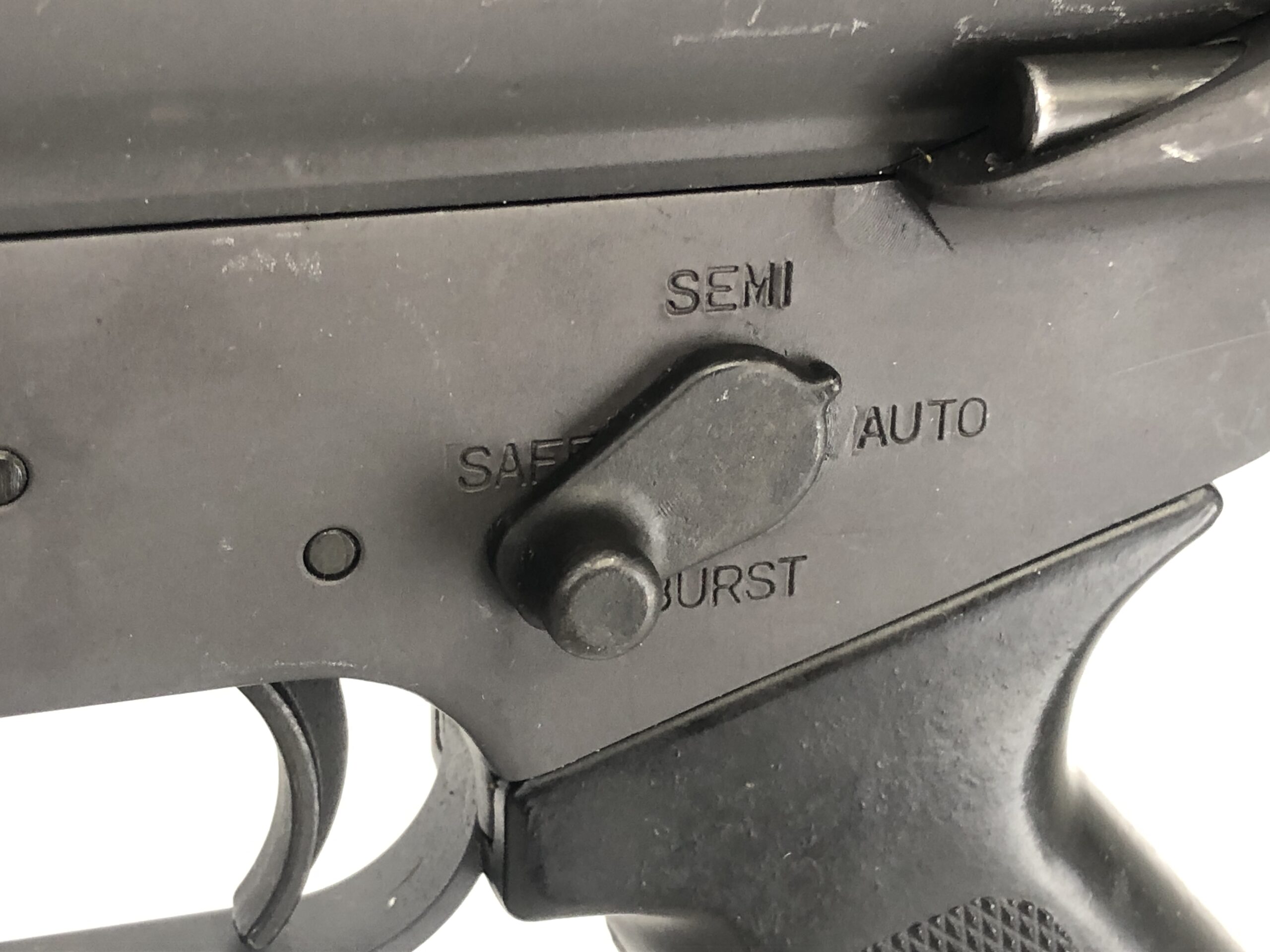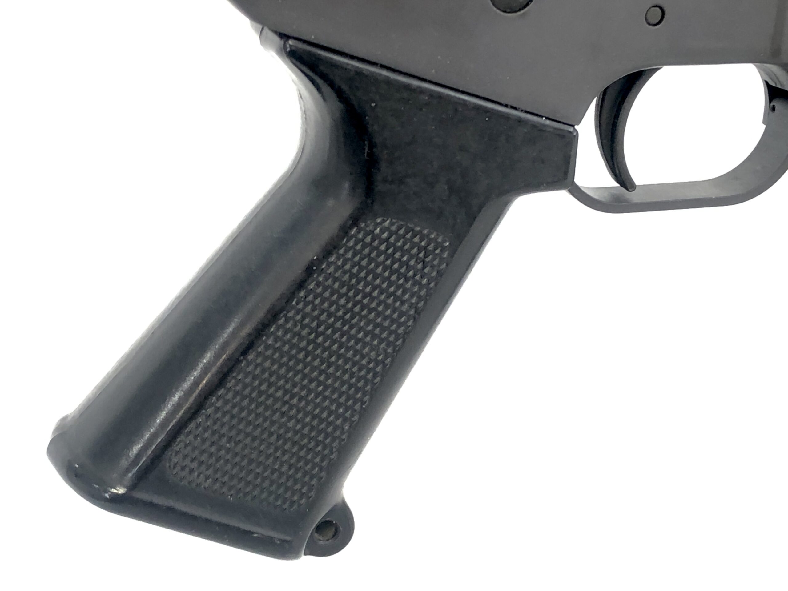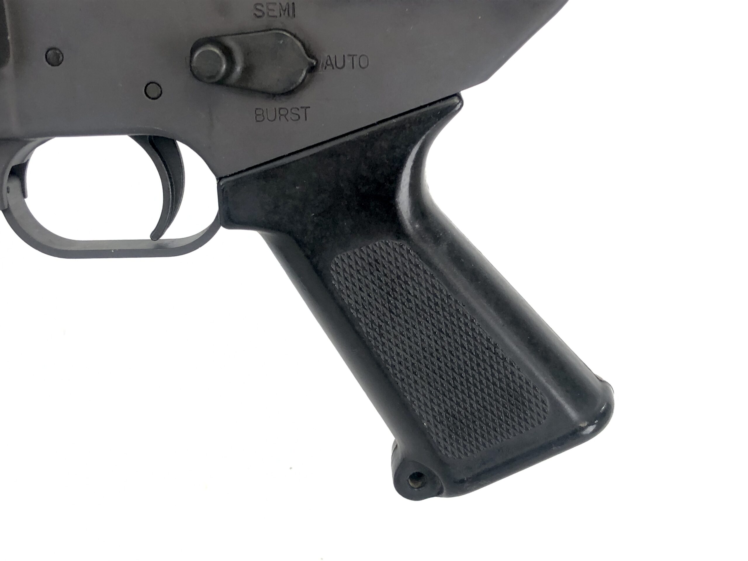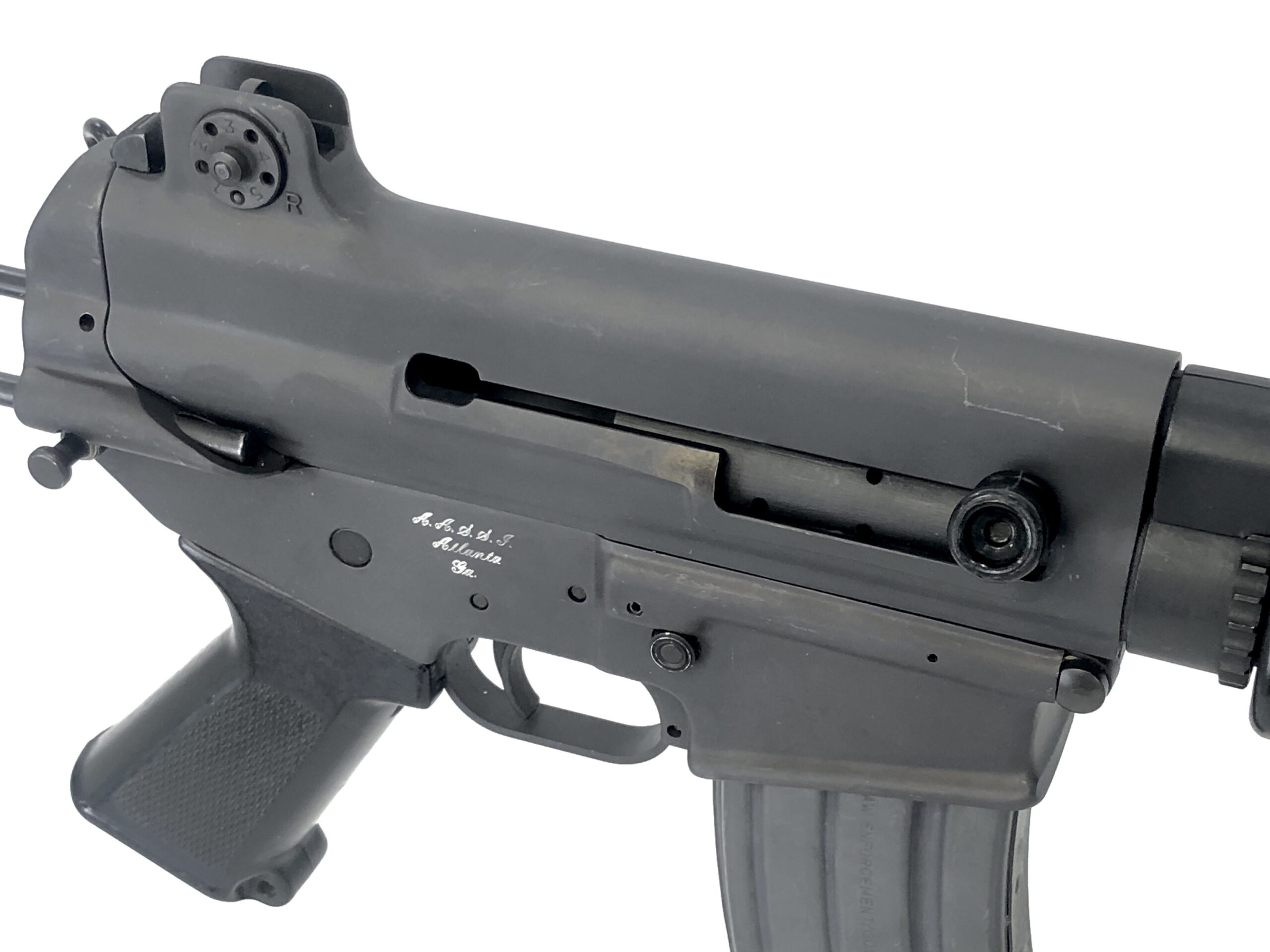 Cosmetically, the parkerized exterior finish remains in excellent overall condition, with only minor handling and surface marks observed in the original factory finish. The right side of the receiver has been engraved with with five cursive initials and “Atlanta, Ga” by a previous owner. The polymer components also appear in excellent condition, with only minor handling marks observed on the pistol grip and rear butt plate of the stock.