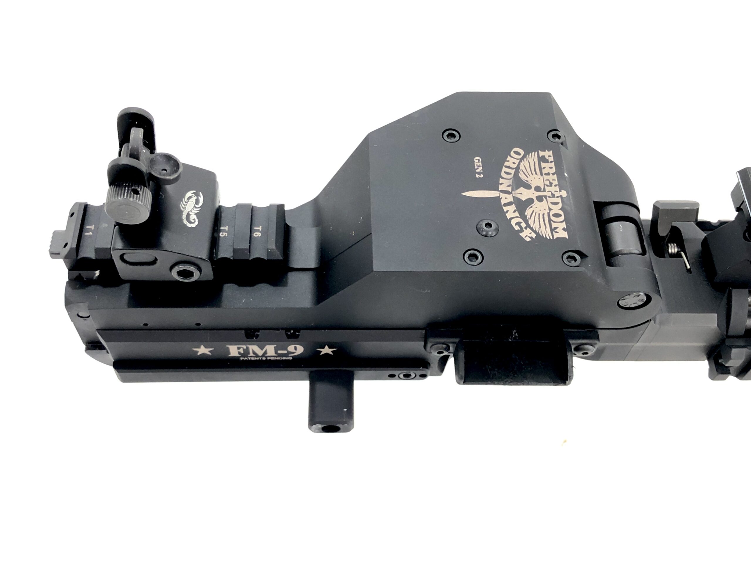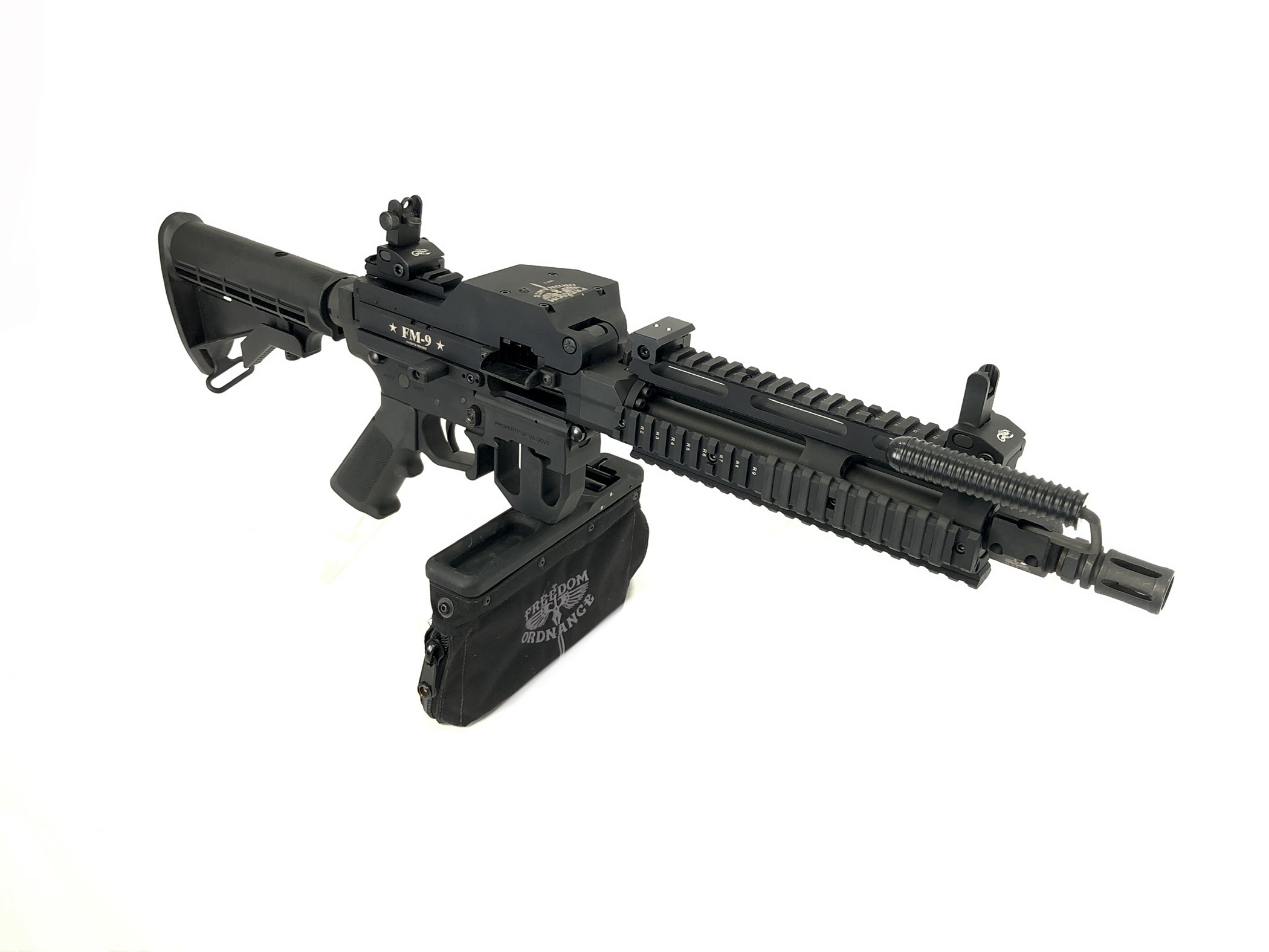 (1) Freedom Ordnance FM-9 9x19mm belt-fed M16/AR-15 M4 upper. Upper includes bolt carrier setup for Lightning Link use, along with flip-up iron sights, a 150rd ammunition box, and approximately 1200 unused Freedom Ordnance 9mm factory ammunition links.