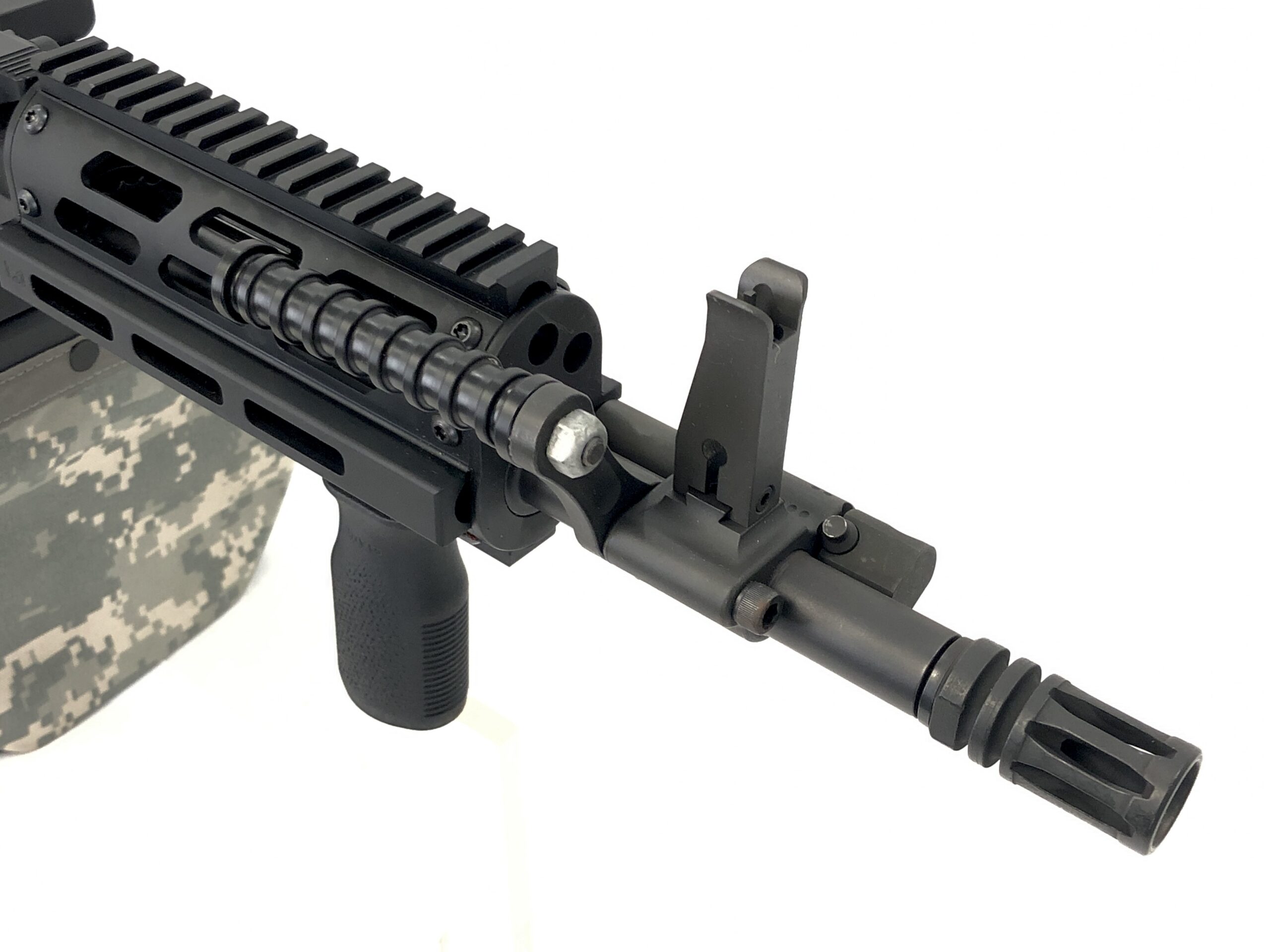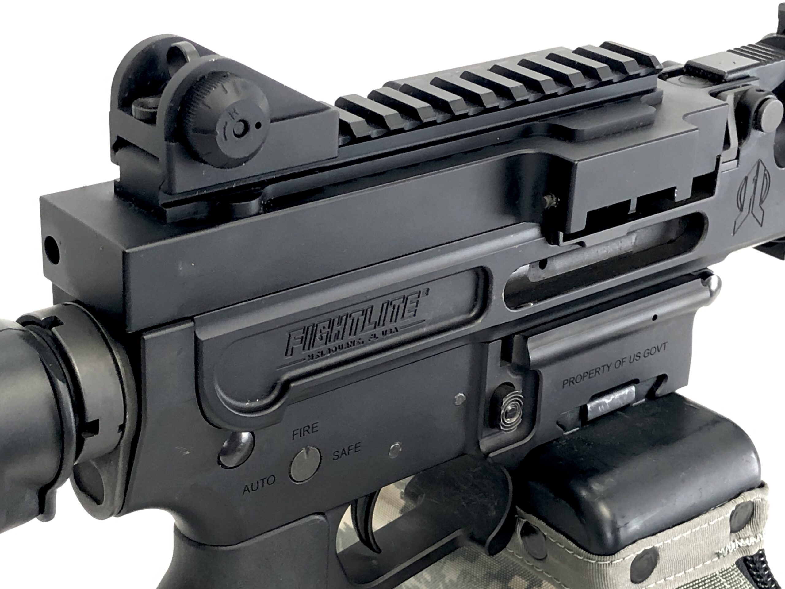 (1) FightLite Industries MCR 5.56mm NATO 12.5″ barreled dual-feed (belt and magazine) complete upper. Upper includes bolt carrier setup for Lightning Link use, along with fixed iron sights, Magpul vertical front grip, an M249 SAW ammunition box, and two Colt 30rd aluminum magazines. (No 5.56mm links or linked ammunition are included).