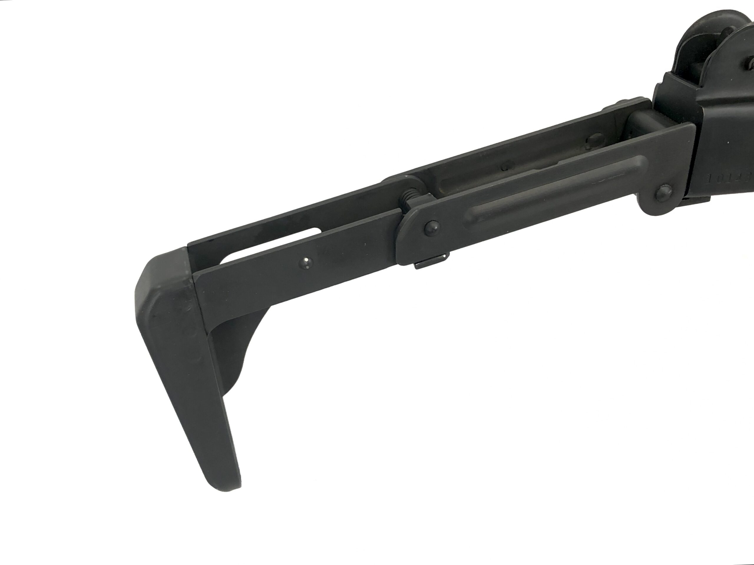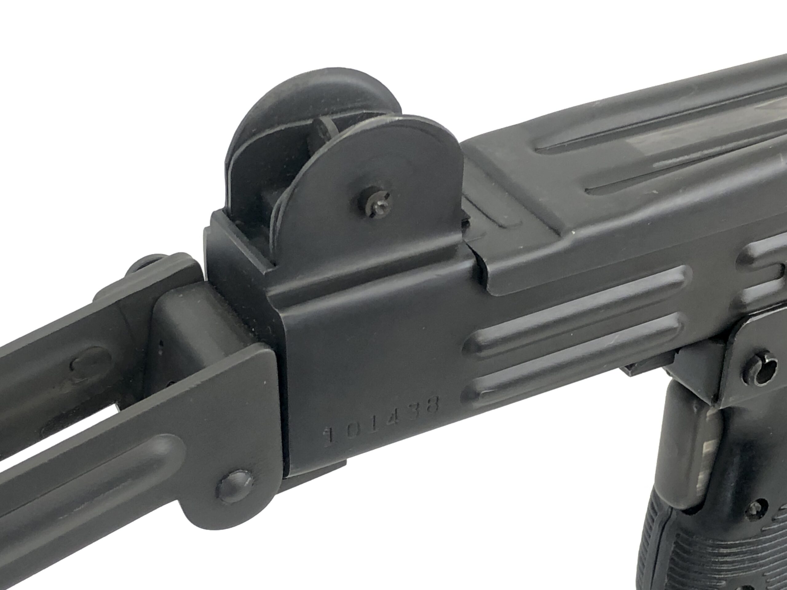 Cosmetically, the exterior parkerized finish is in very good to excellent condition, with only minor handling and use marks observed, most notably at the metal-to-metal contact points of the folding stock and the cocking knob on the top cover. The polymer forearm and pistol grip are in excellent, like new condition, with no observable wear or markings.