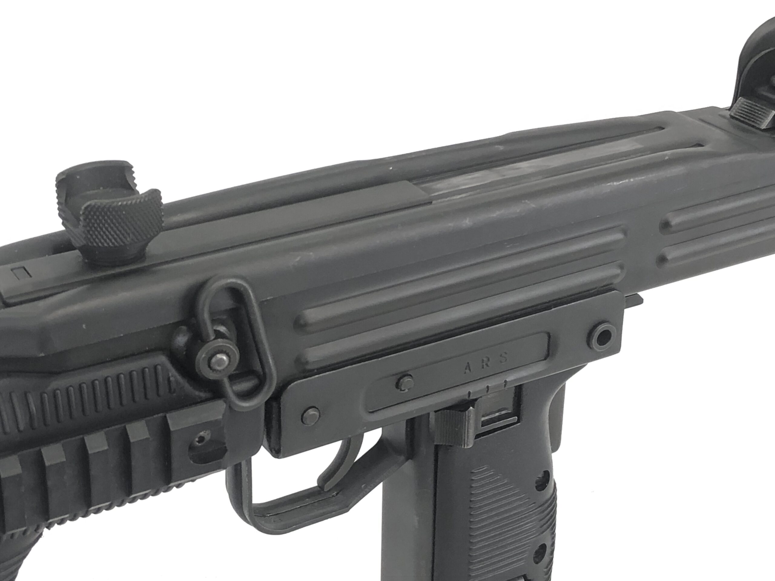 This beautiful workhorse of a factory submachine gun features its original parkerized finish, ARS marked fire controls, and a factory original under folding stock. The forearm has been upgraded to a vertical handgrip forearm with Picatinny accessory rails on both the right and left sides manufactured by US Barrel Shrouds. Purchase of this transferable submachine will also include an original design front forearm, an Israeli wood stock, an OD Green military web sling, and four total magazines (two 32rd mags and two Israeli IDF marked 25rd mags).