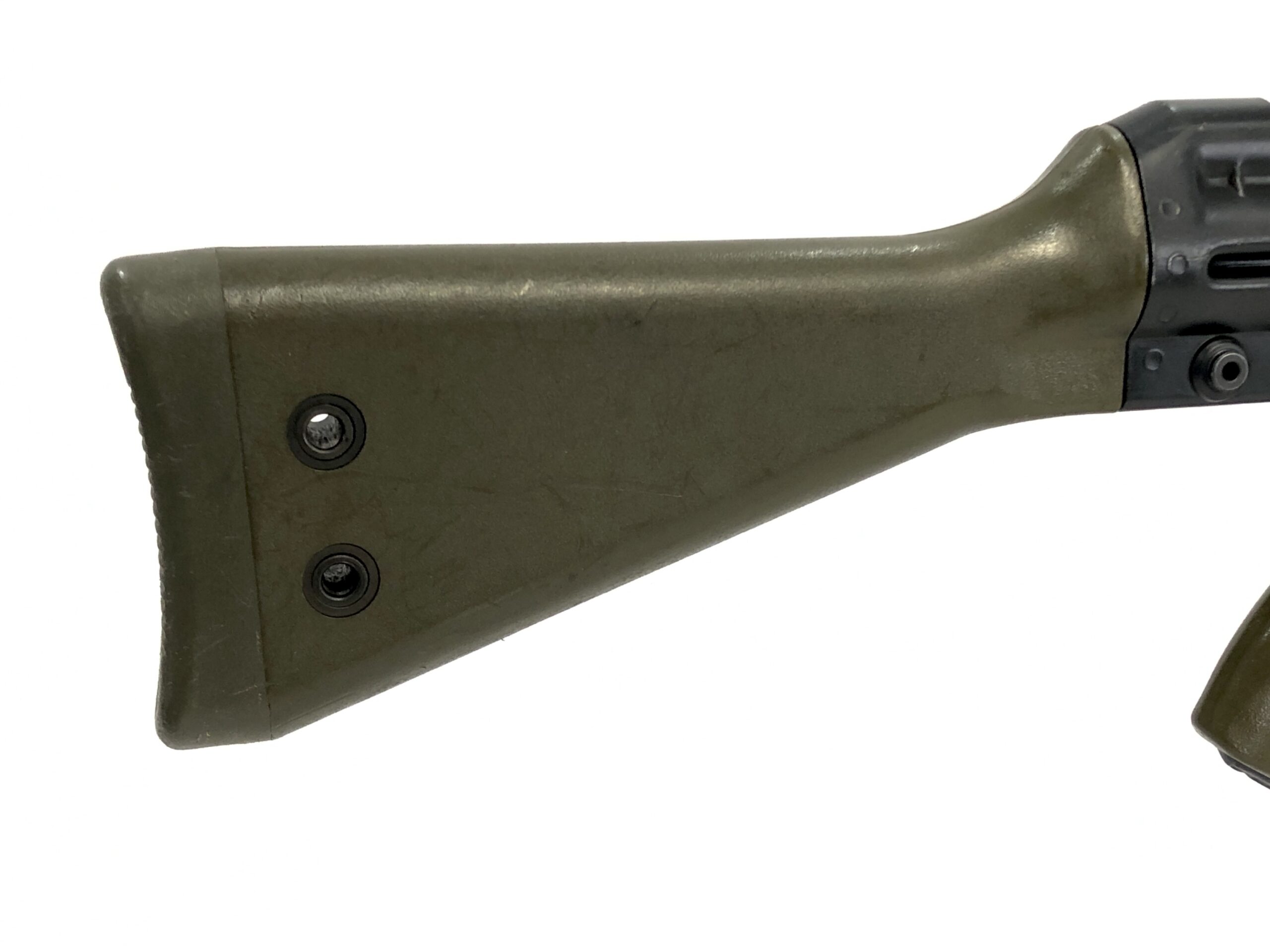 As an original, H&K factory production gun, this transferable select-fire machine gun features the H&K machine gun push pin design that allows all H&K factory trigger packs to be installed. This model is IE date coded (1984) and features an original SEF trigger pack with safe, semi-automatic, and full-automatic fire modes. It also features its original HK A3 fixed OD Green stock to match it’s OD Green pistol grip and wide forend. This model is factory marked as “G3 FS” noting that from the factory it includes the “freischwinger” upgrades, which included a free-floated barrel and an upgraded rear drum sight that greatly improved the accuracy over the original G3 design. This model is often designated as a “G3E”, as well, as it is a G3 that was intended by Heckler & Koch GmbH for export to foreign entities. Purchase of this transferable machine gun will include the attached wide-style HK forend, as well as a factory original HK slimline forend, four total HK factory magazines ( two steel 20rd and two aluminum 20rd magazines), and an original German cleaning kit.