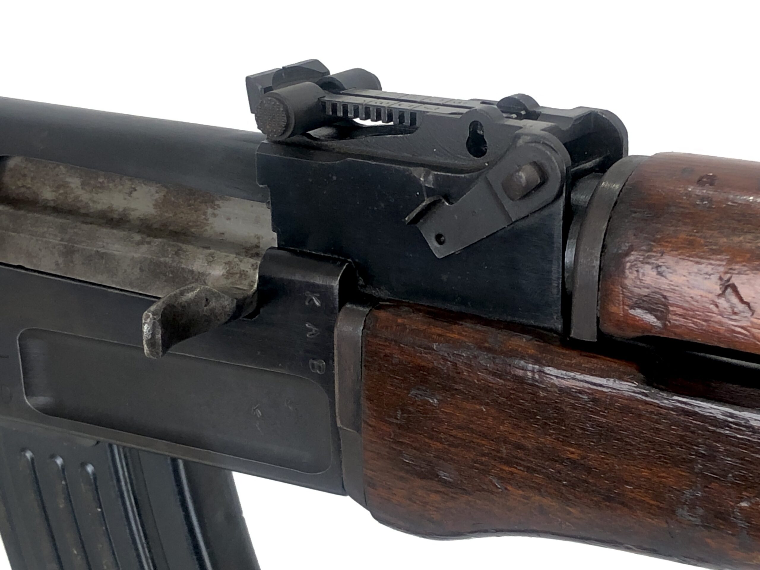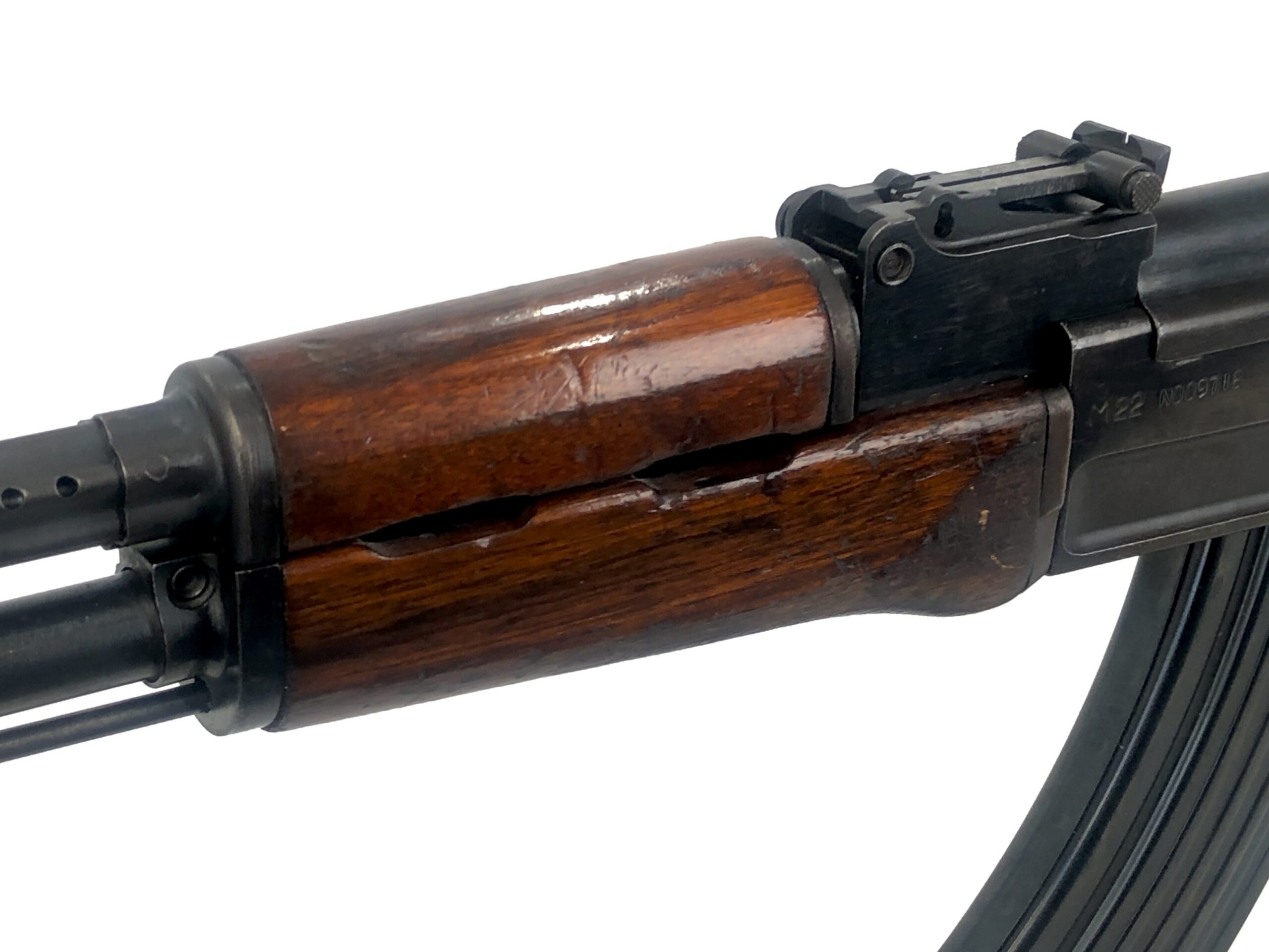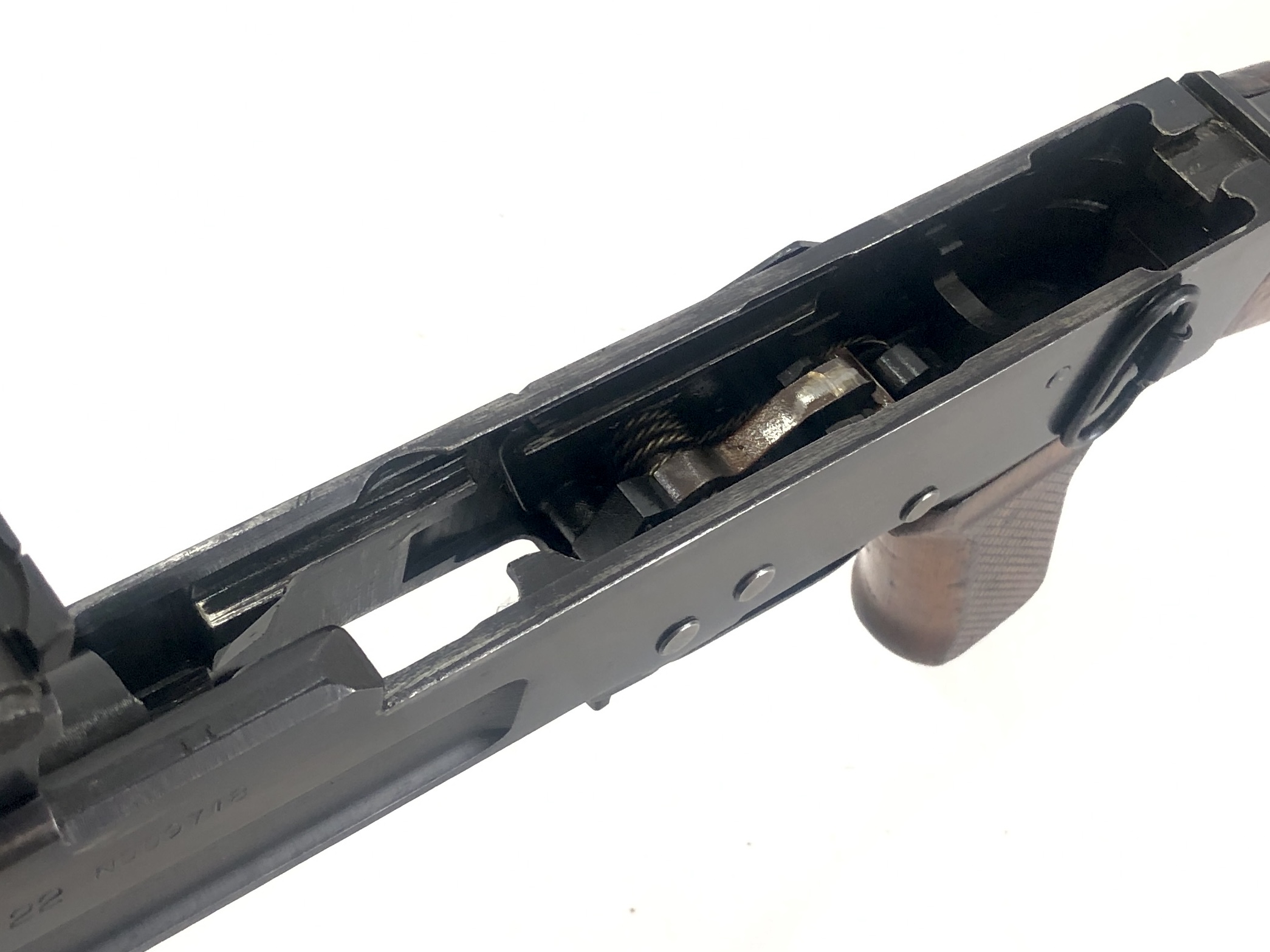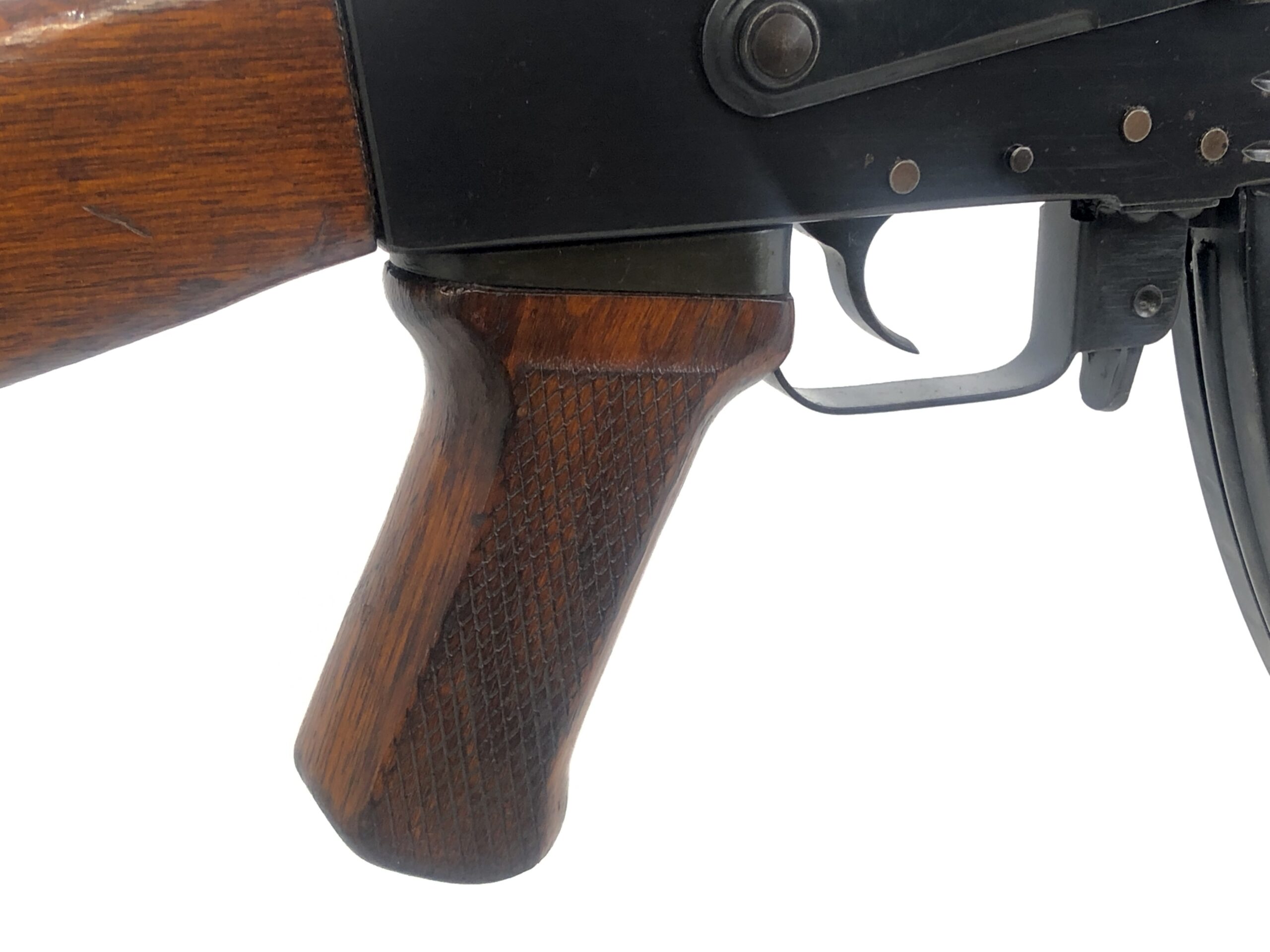 The M22 was China’s late 1950’s through the 1960’s export version of the Communist Chinese military’s standard Type 56 AK-47 platform machine gun. This model was originally built by the PRC in state factories for export to other Communist friendly areas and causes. As an export variant, this model features Chinese Pinyin markings for full-automatic and semi-automatic operational modes. (Pinyin is the official Chinese system for translating Mandarin Chinese sounds using the Latin alphabet). On this weapon, the letter “L” is the marking for full-automatic (for the Chinese 连 (“Lian”) which translates as “chain” or “link successively”) and the “D” is the selector marking for semi-automatic (for the Chinese 单 (“Dan”) which means “single” or “only”). These Cold War models were commonly encountered in areas that did not speak Mandarin Chinese, such as North Vietnam, and were typically arrived in the US as war trophies and amnesty registered “bring back” weapons. This model notes no import markings and is NFA registered, so it is most likely that it, too, is a bring back model from Vietnam, however this is not accompanied by any supporting documents.