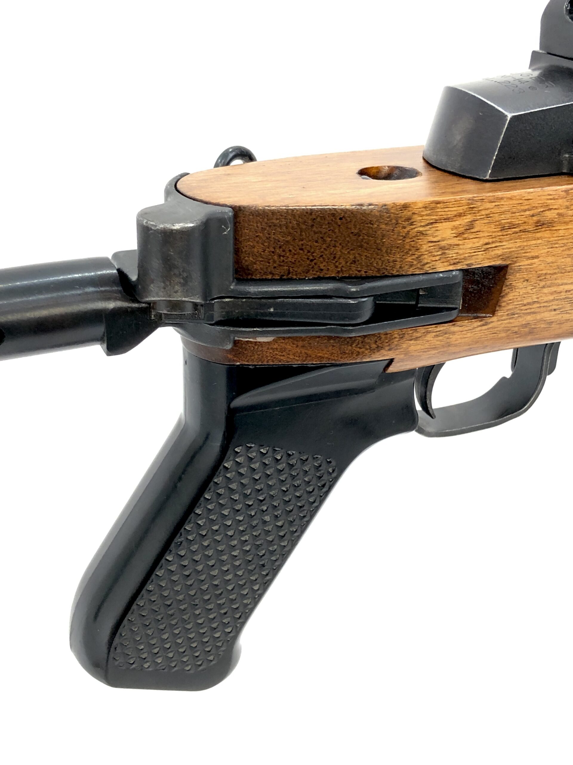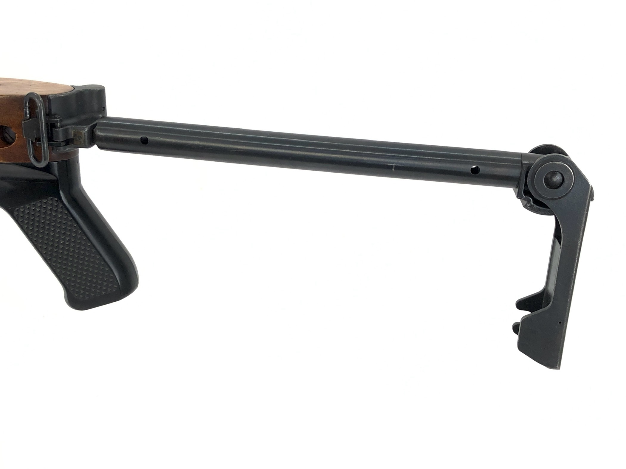 Cosmetically, this transferable machine gun is also in very good overall condition with only minor handling and use marks noted at various spots. The factory original blued finish notes some minor use and handling marks on the edges of the original factory finish, but remains with roughly 90% of its original blue finish. The wood stock is in excellent condition, with only minor light surface markings observed in the metal of the folding stock. The birch wood of the stock is in outstanding condition, with no dents, dings, scratches, etc. observed. The HUXWRX FLOW 556K suppressor and HUXWRX flash hider are factory new in box, having only been mounted for the pictures and then removed.