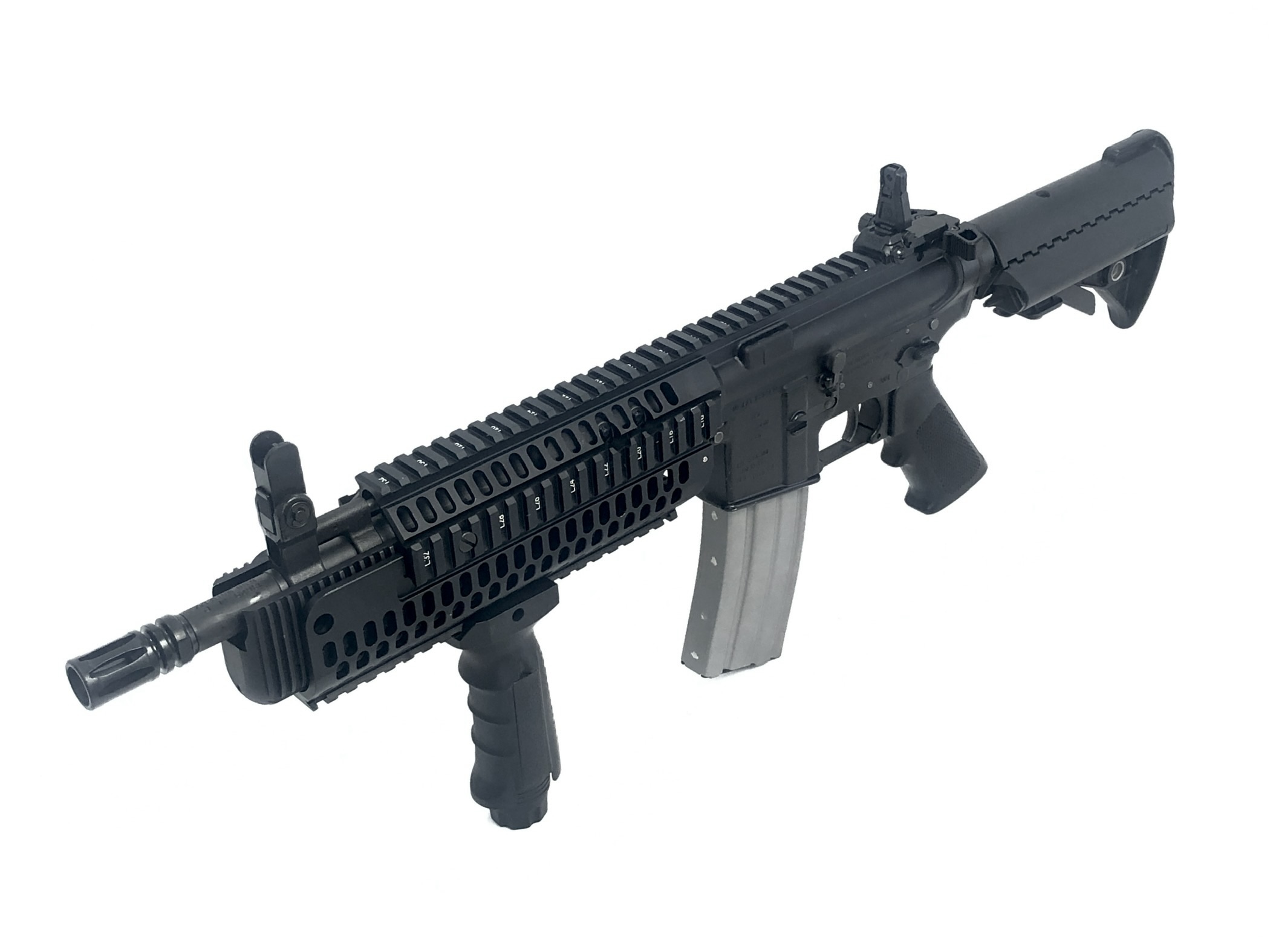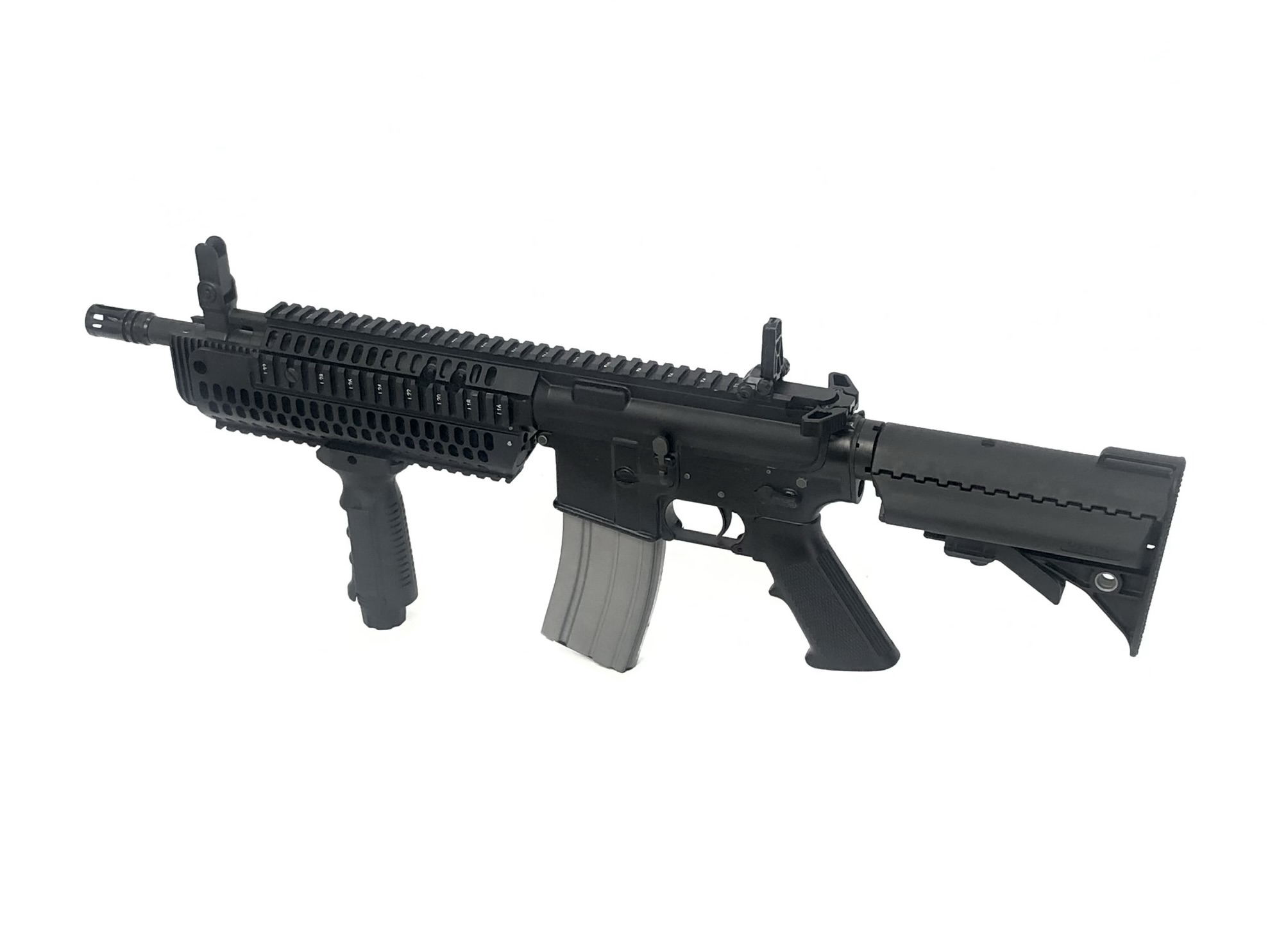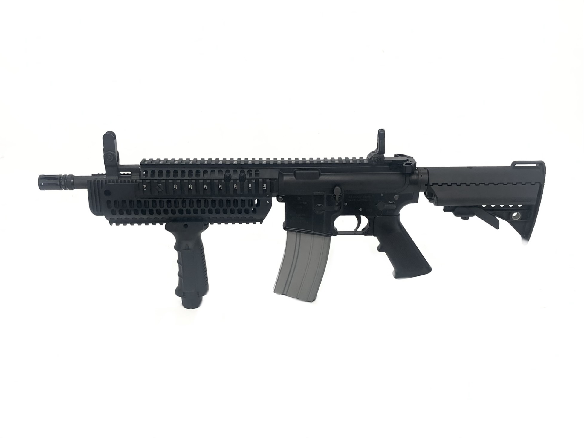 Manufactured and NFA registered by Bushmaster Firearms Inc. in Windham, ME using a Sendra Corporation receiver, this transferable select-fire machine gun lower receiver features a standard milspec front pin size, allowing it to accept all milspec sized M16/M4 uppers. It is “AUTO” marked on the left side selector. It also currently proudly operates with a factory new Colt IAR 5.56mm NATO upper with an 11.5″ barrel. Along with it’s full-auto, three position fire controls, this transferable machine gun setup also features a Vltor collapsible stock with a Colt H2 heavy buffer and a forward vertical grip assembly. Purchase of this weapon will also include and original BFI marked 30rd aluminum magazine.