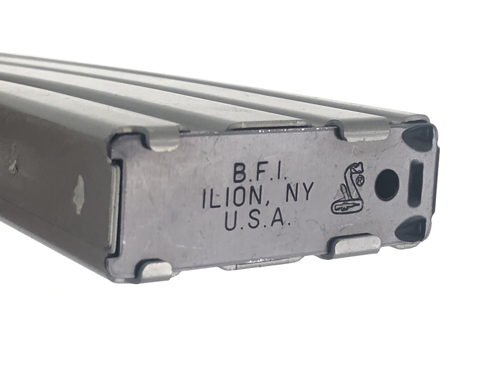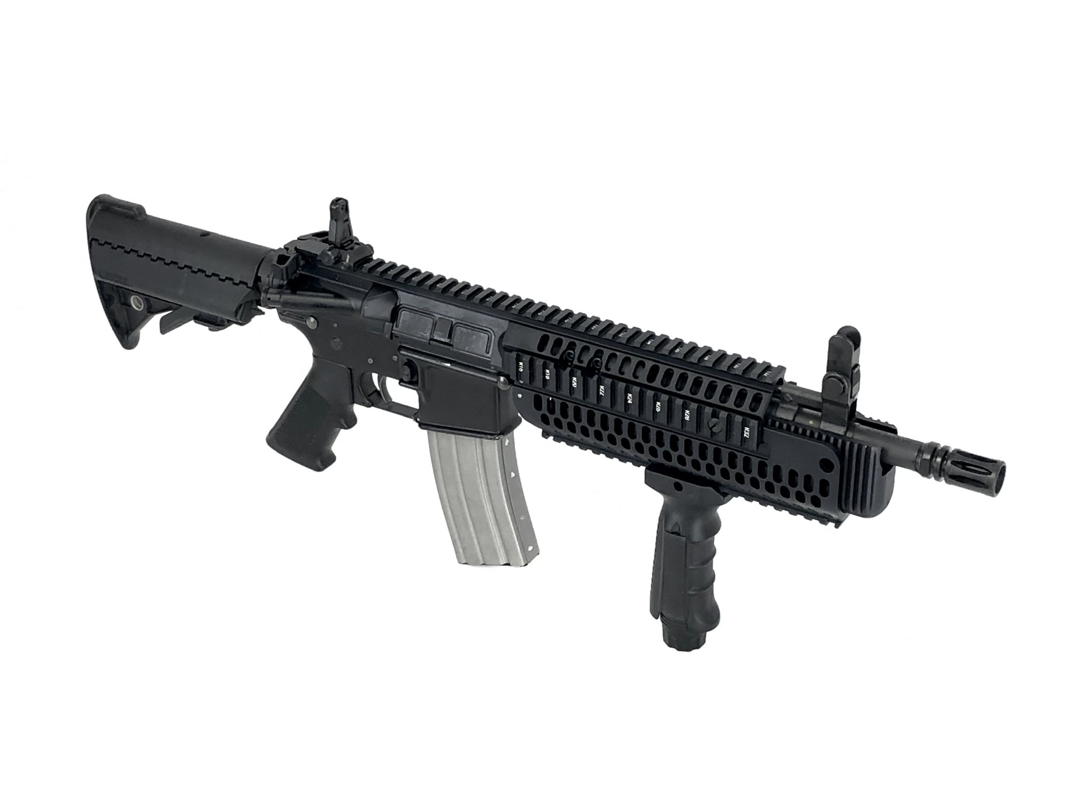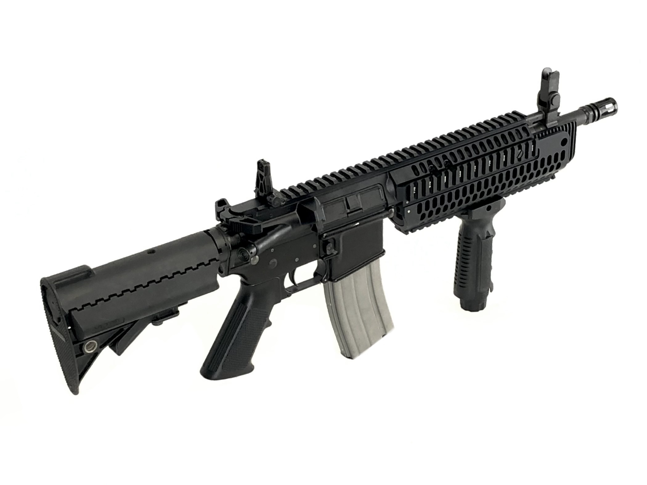Manufactured and NFA registered by Bushmaster Firearms Inc. in Windham, ME using a Sendra Corporation receiver, this transferable select-fire machine gun lower receiver features a standard milspec front pin size, allowing it to accept all milspec sized M16/M4 uppers. It is “AUTO” marked on the left side selector. It also currently proudly operates with a factory new Colt IAR 5.56mm NATO upper with an 11.5″ barrel. Along with it’s full-auto, three position fire controls, this transferable machine gun setup also features a Vltor collapsible stock with a Colt H2 heavy buffer and a forward vertical grip assembly. Purchase of this weapon will also include and original BFI marked 30rd aluminum magazine.