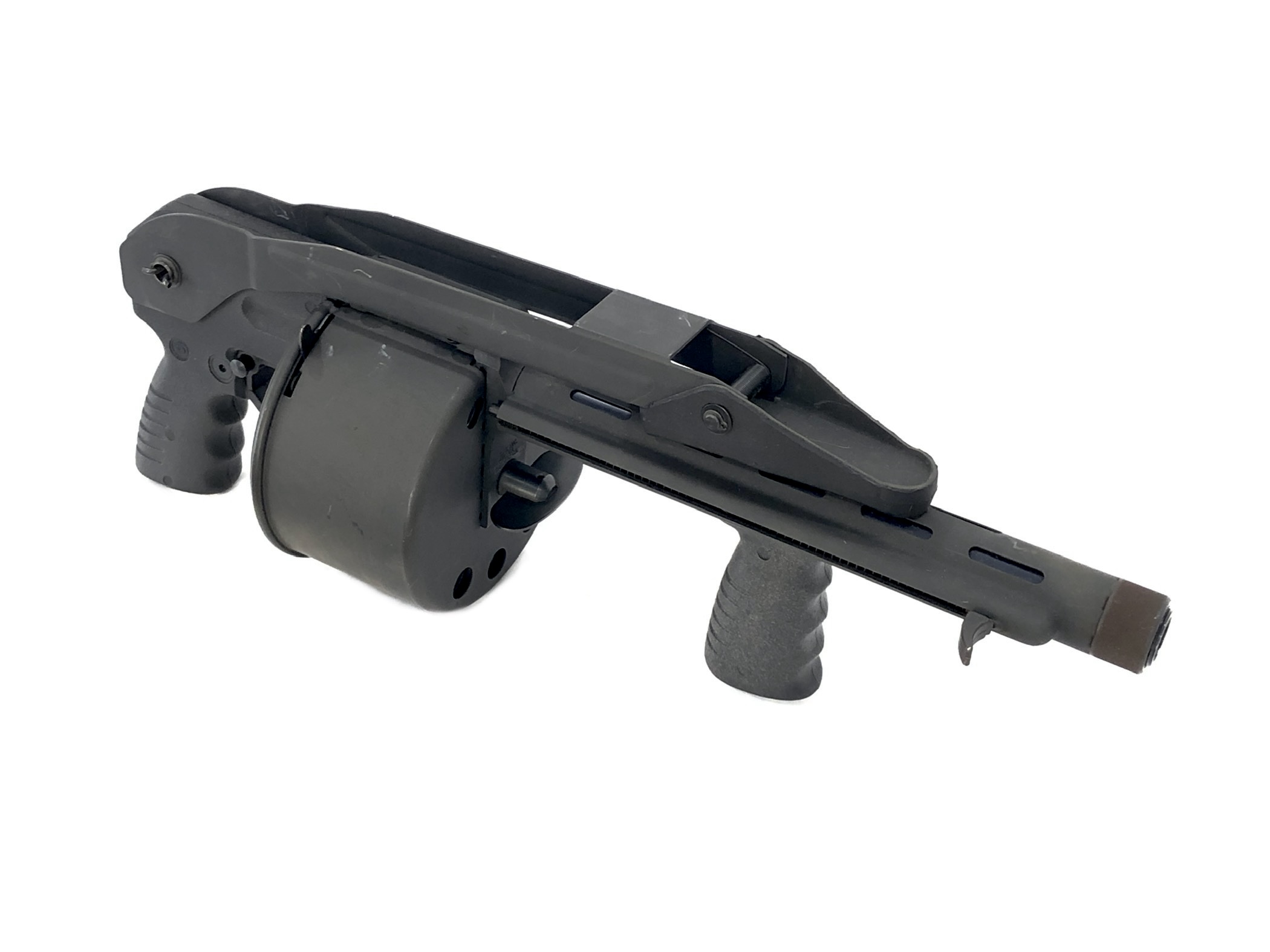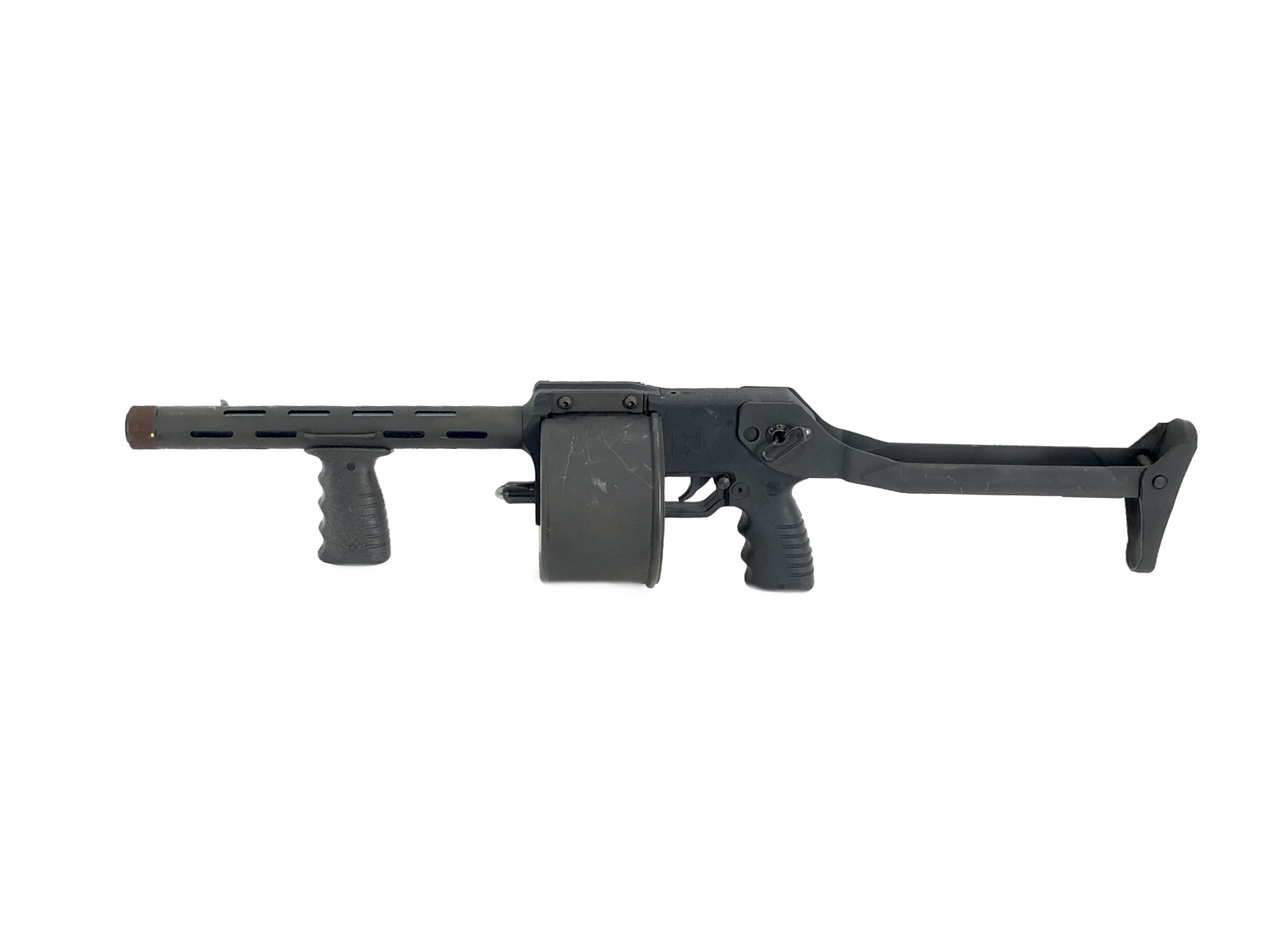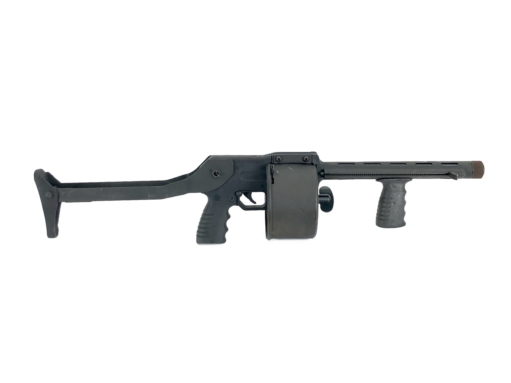 This weapon is in overall excellent mechanical and functional condition. The bore remains bright and shiny. The rotary cylinder mechanism operates appropriately, with good spring tension in the magazine cylinder. The weapon functions correctly with standard 12ga ammunition. The folding stock mechanism operates correctly and remains tight and solid both in folded and extended positions. Cosmetically, this registered Destructive Device is in overall very good condition. It does show some minor exterior handling and use marks and light surface scratches in original parkerized finish (see photos) but no cracks, dents, dings, malformations, etc., in the metalwork or in its polymer rear grip.