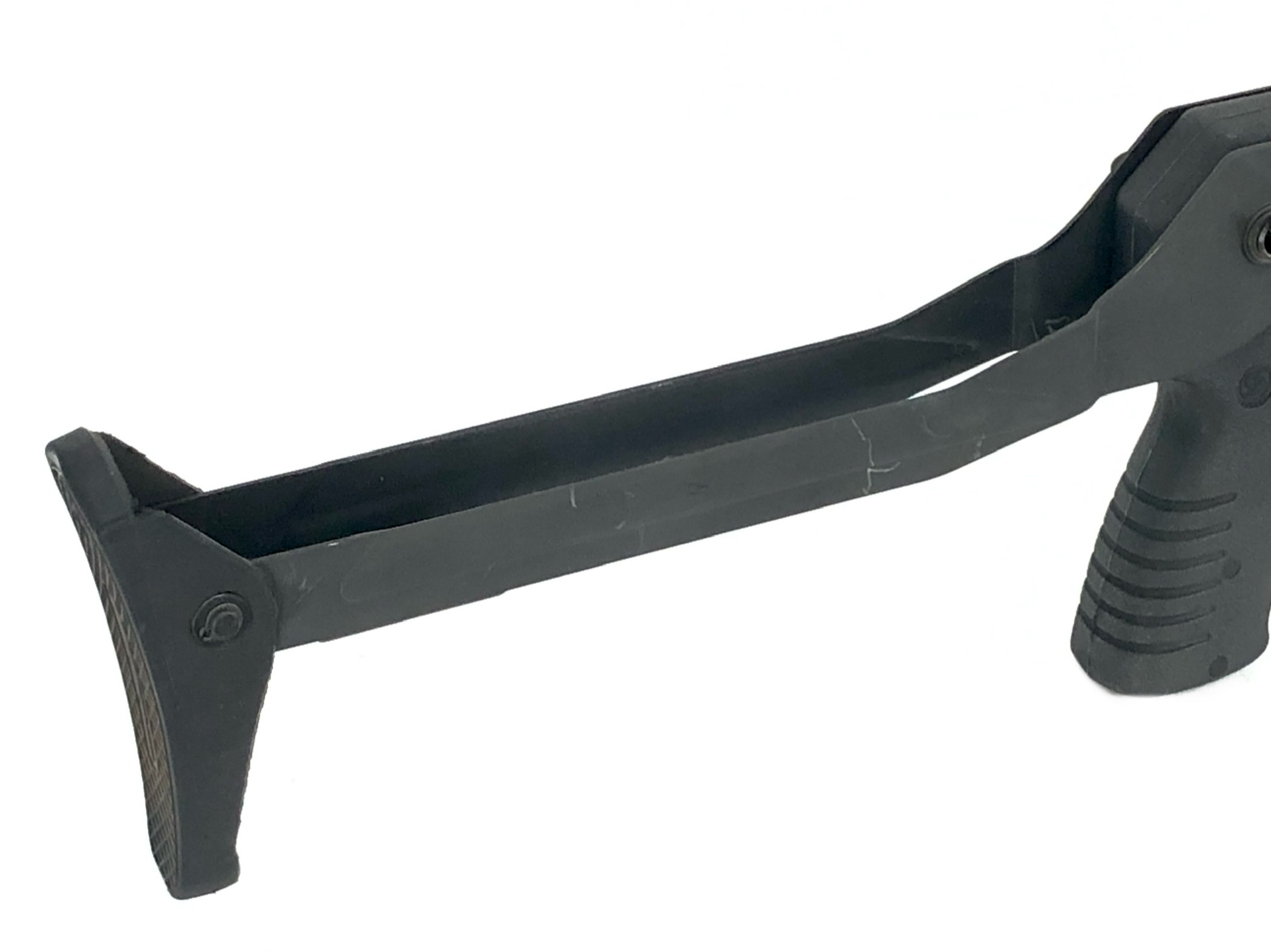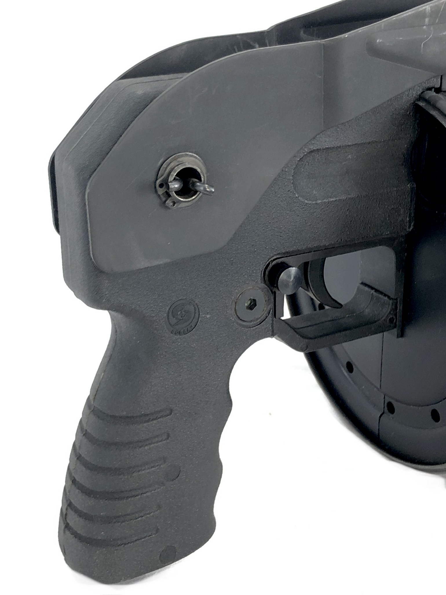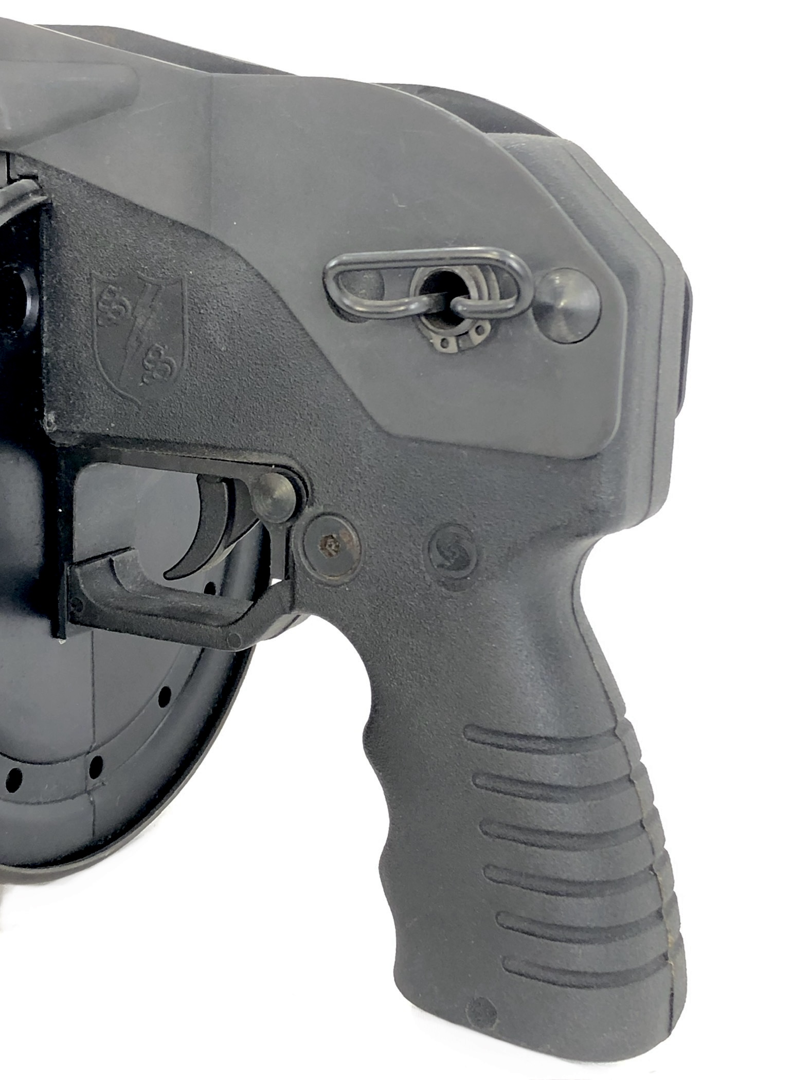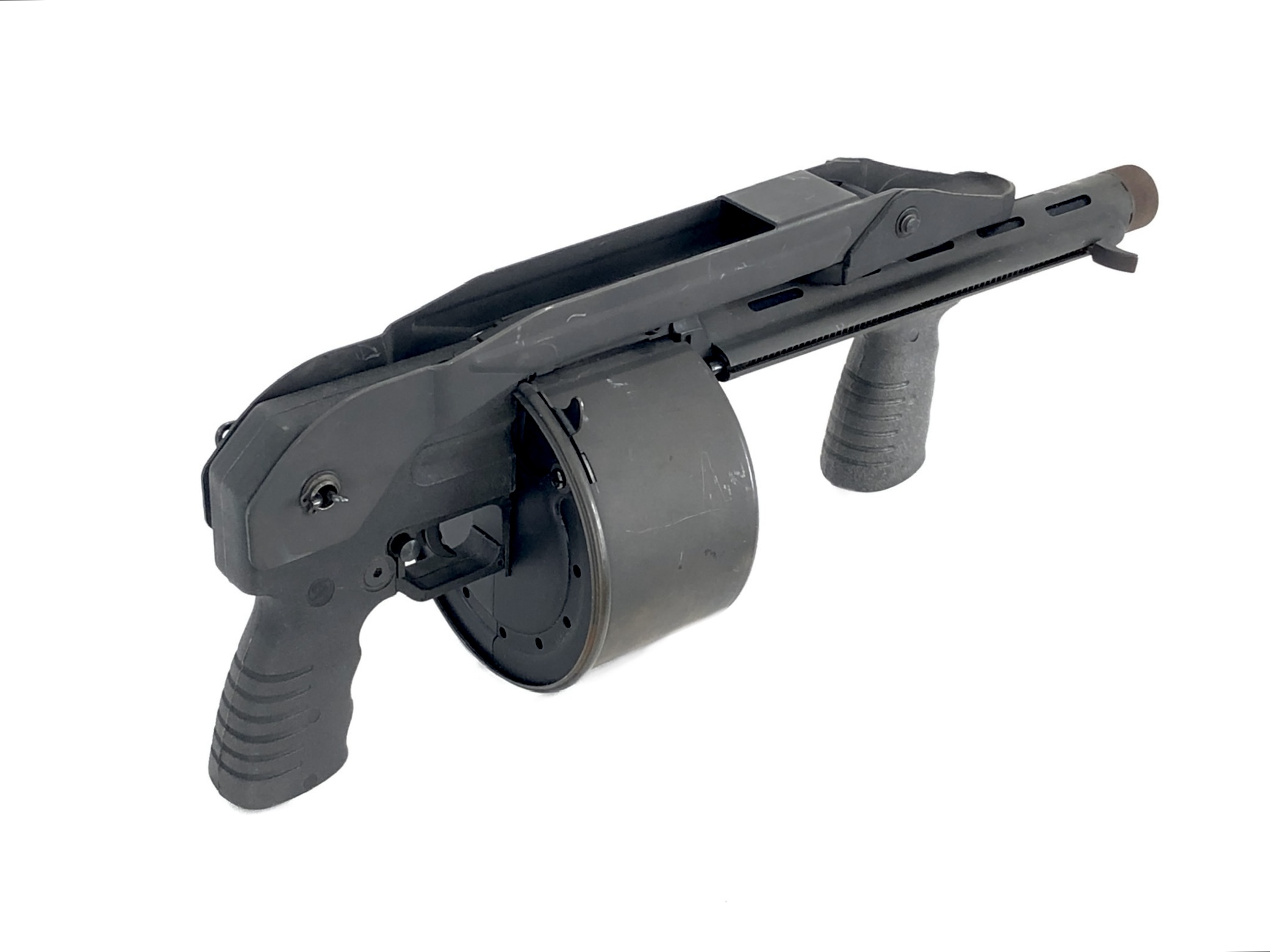 This weapon is in overall excellent mechanical and functional condition. The bore remains bright and shiny. The rotary cylinder mechanism operates appropriately, with good spring tension in the magazine cylinder. The weapon functions correctly with standard 12ga ammunition. The folding stock mechanism operates correctly and remains tight and solid both in folded and extended positions. Cosmetically, this registered Destructive Device is in overall very good condition. It does show some minor exterior handling and use marks and light surface scratches in original parkerized finish (see photos) but no cracks, dents, dings, malformations, etc., in the metalwork or in its polymer rear grip.