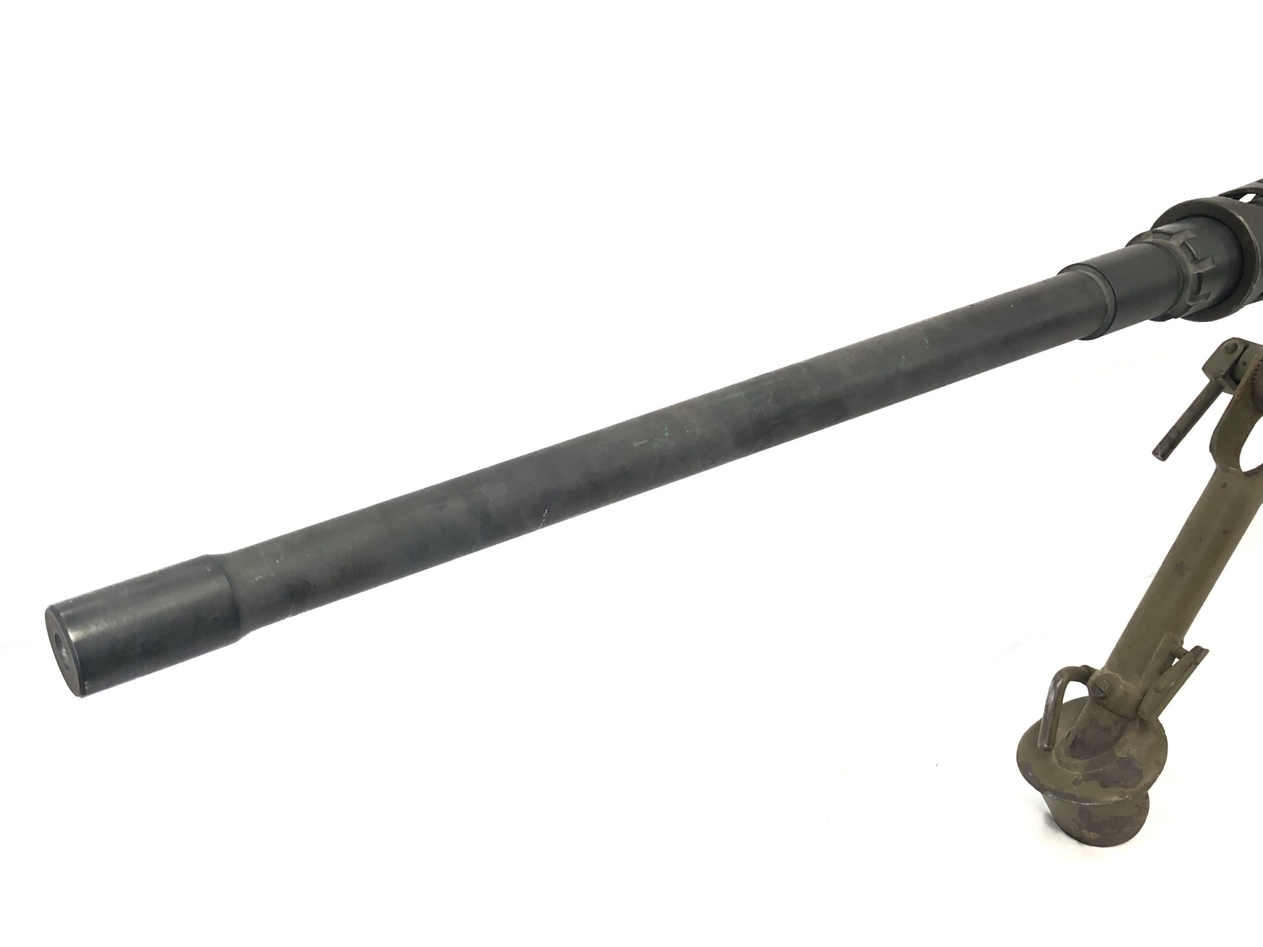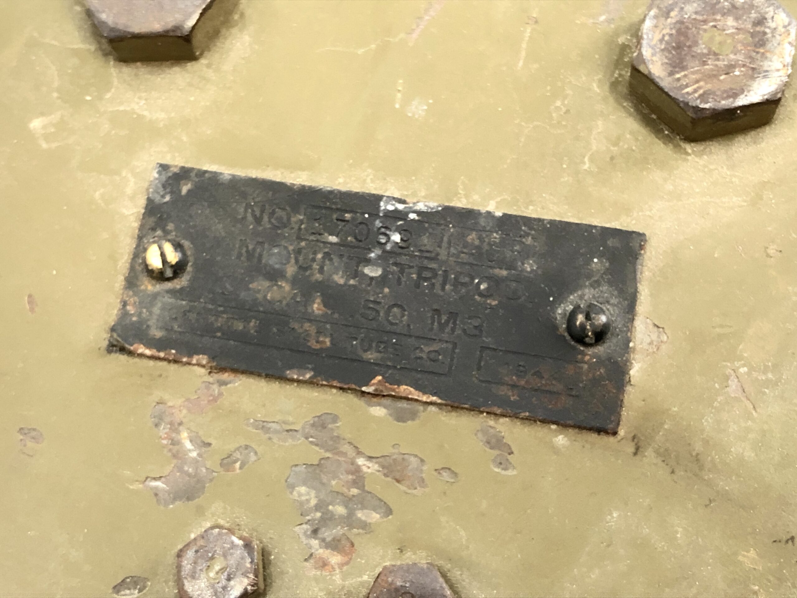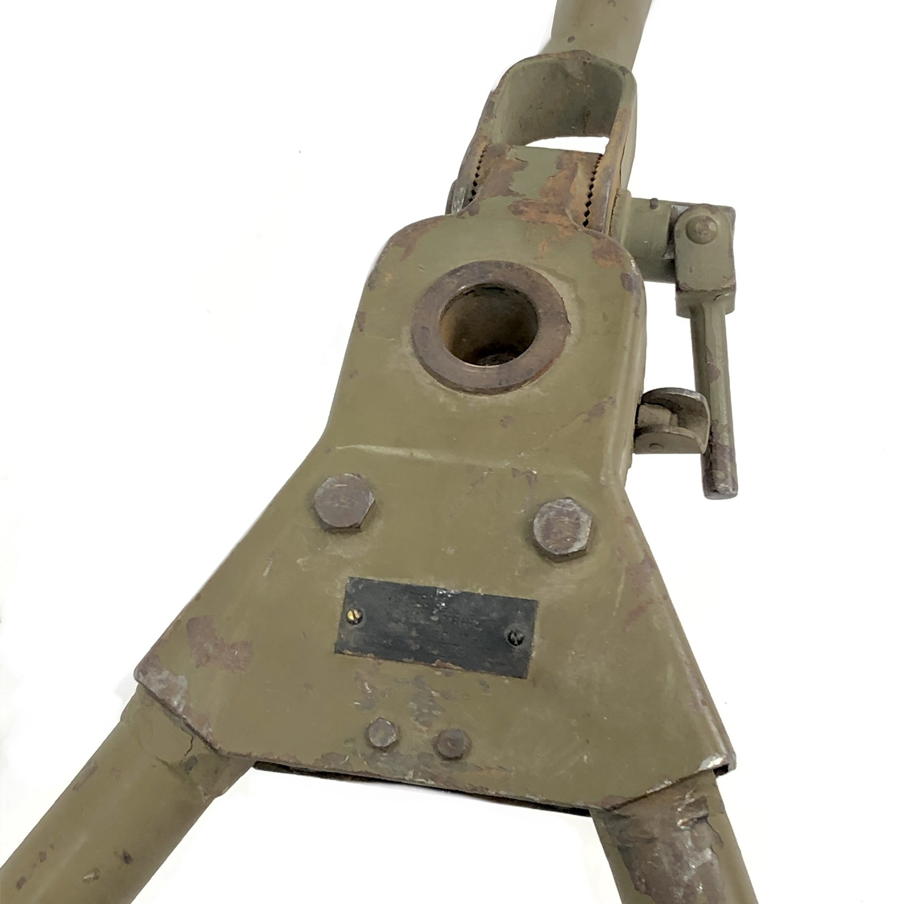 Purchase includes the pictured WWII-era ground tripod, pintle mount, and T&E mechanism, along with a Pelican-style wheeled hard case for the receiver, barrel, mount, and T&E (case not pictured). The tripod notes minor paint chipping and oxidation patches at spots, but remains fully functional and operational. The pintle mount is also in very good condition, with only moderate finish wear observed. The T&E is in very good condition, as well, with only minor surface markings.