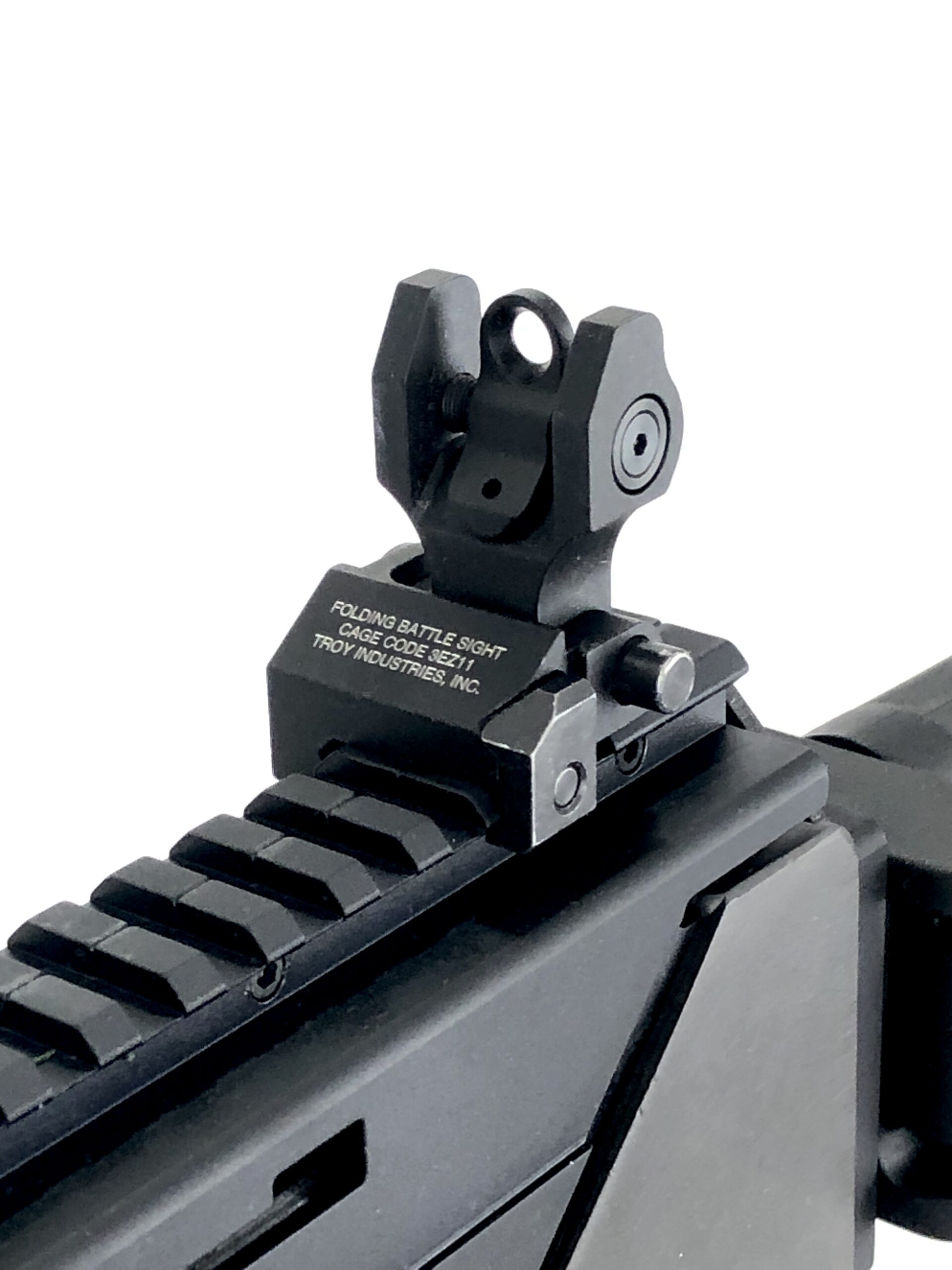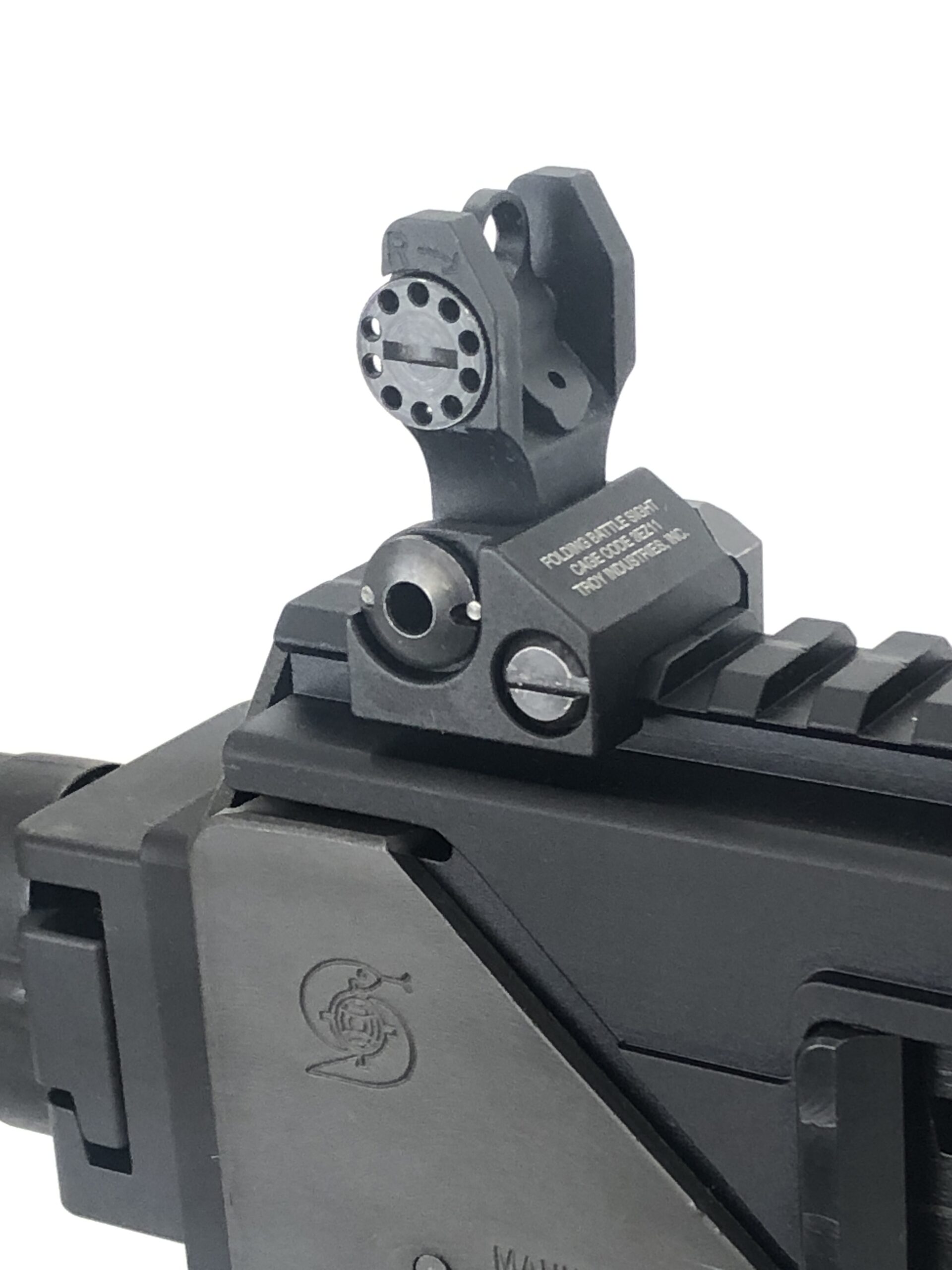 This gorgeous transferable submachine gun is in outstanding overall mechanical and cosmetic condition and appears to have been fired very little. The fire control mechanism notes only very minor wear and use markings. The original bolt assembly notes only very minor wear. The original barrel is bright and shiny with crisp, clean rifling. The exterior parkerized finish on both the lower receiver and the upper receiver is beautiful and consistent, with no noted handling or use marks observed. The upgraded accessories are all in factory new condition, with the exception of the Troy battle sights, which where previously mounted. Purchase of this model will include a total of five magazines (one parkerized magazine and four polished blue versions).