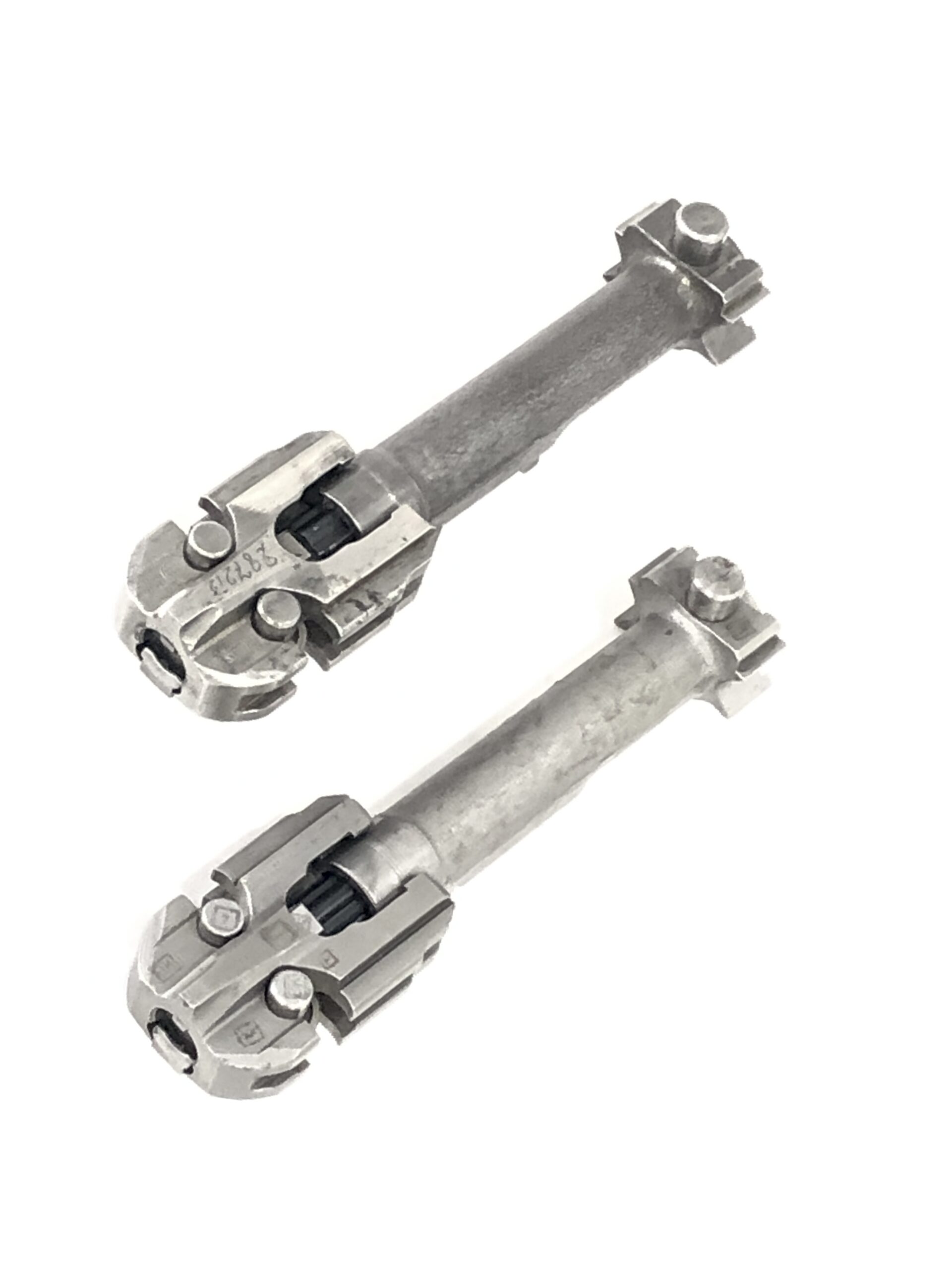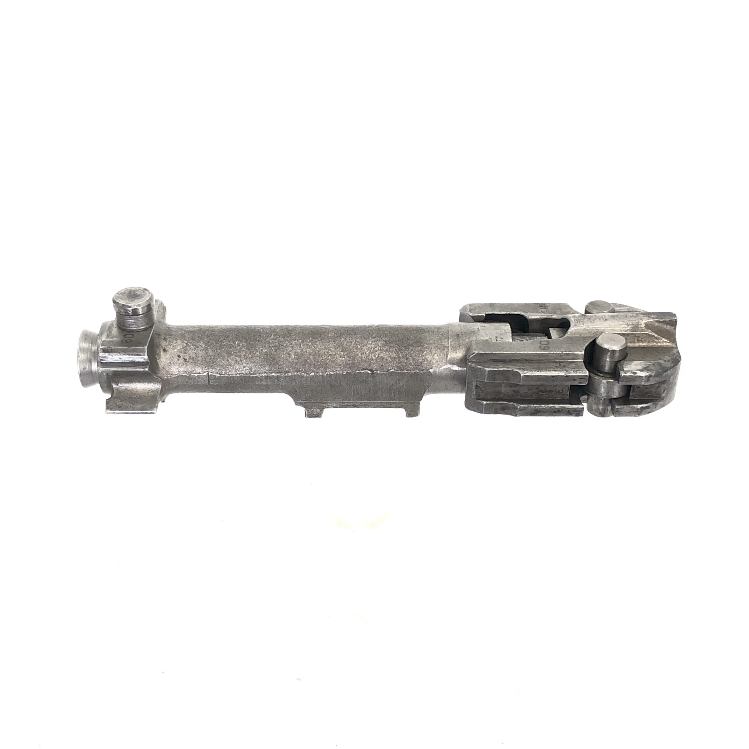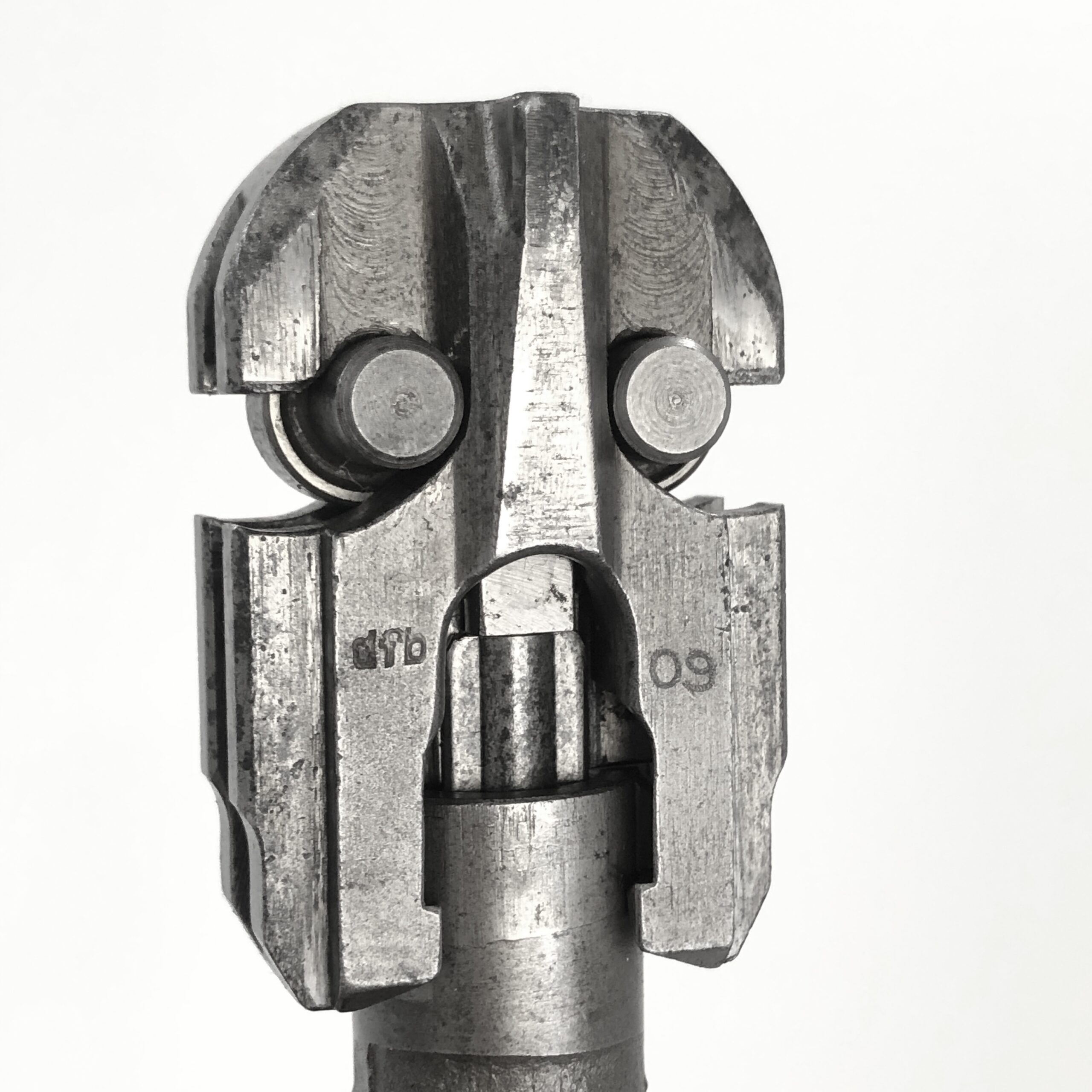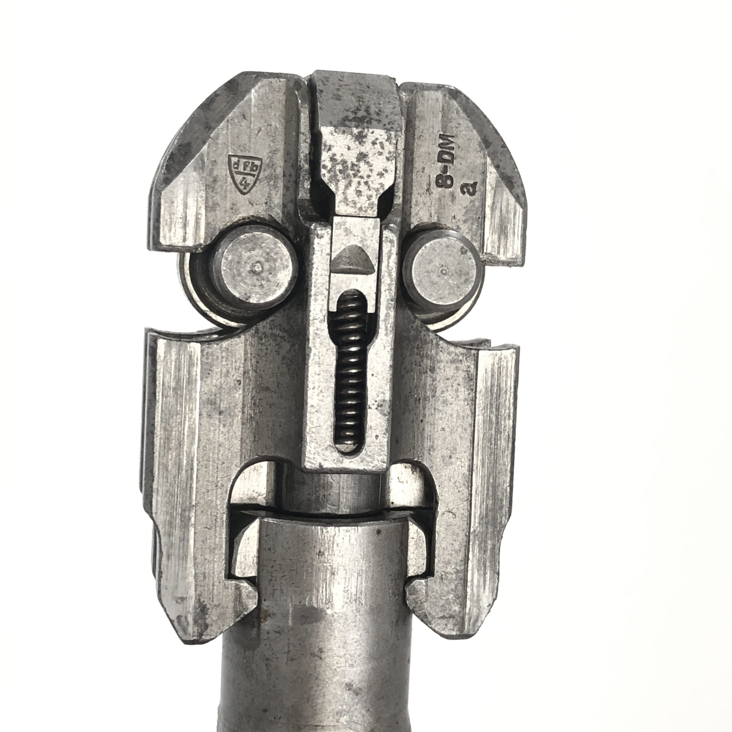 Cosmetically, the original factory finish has patinaed at a majority of spots to an eye-pleasing gray and auburn patina. All parts appear to be original factory finish. The right side of the barrel shroud notes some significant finish wear at the connection point to the barrel removal lever. No corrosion or oxidation is observed.  The wood stock and pistol grip panels both display some minor handling marks and small chips on the exterior, but no structural concerns. Purchase of this model will include two additional MG 42 bolts, one is a WWII German production bolt while the other appears to be a Post-War bolt, possibly of Yugoslavian origin.