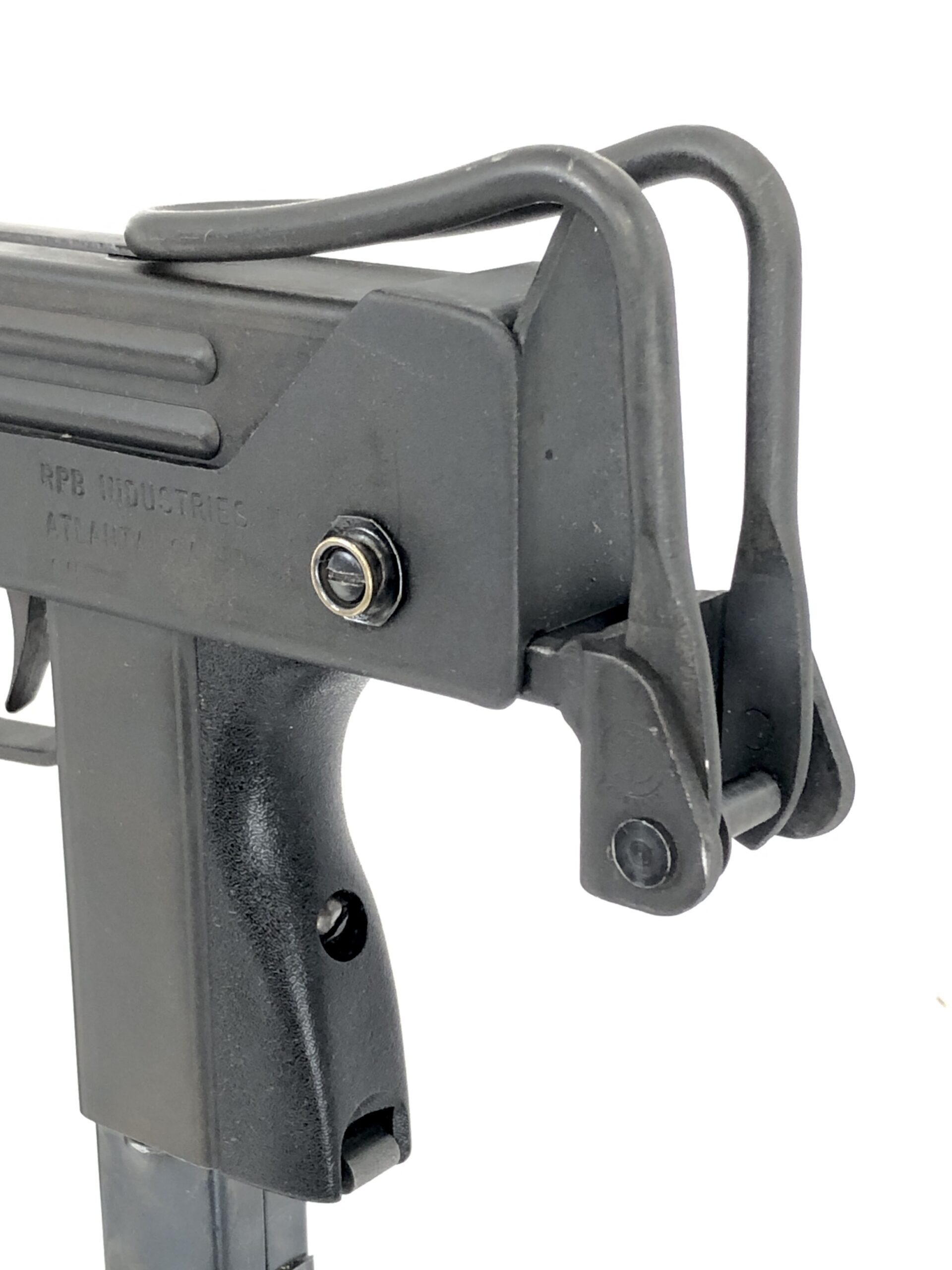 Still considered the fasted submachine in the world with a fire rate of approximately 1800rds a minute, this beautiful MAC-11 submachine gun was built by RPB Industries using a lower receiver flat originally manufactured and marked by Military Armament Corp. in their Powder Springs, GA facility. This is commonly referred to as “double stamp” model as it displays manufacturer information from both entities. This model is chambered in .380ACP, as designated by the 9mm AUTO K markings on the right side of the gun, indicating 9mm short, aka .380ACP. This weapon uses the highly reliable RPB .380acp metal magazines. Purchase will include three original 30rd RPB factory magazines. This model also features it’s original telescoping stock, original front grip strap, and will come with a Bowers Group CAC380 NFA suppressor. The front takedown pin has been updated to a Lage Manufacturing 1-Piece Receiver Pin that uses a spring loaded ball detent to securely attach the lower and upper receivers.